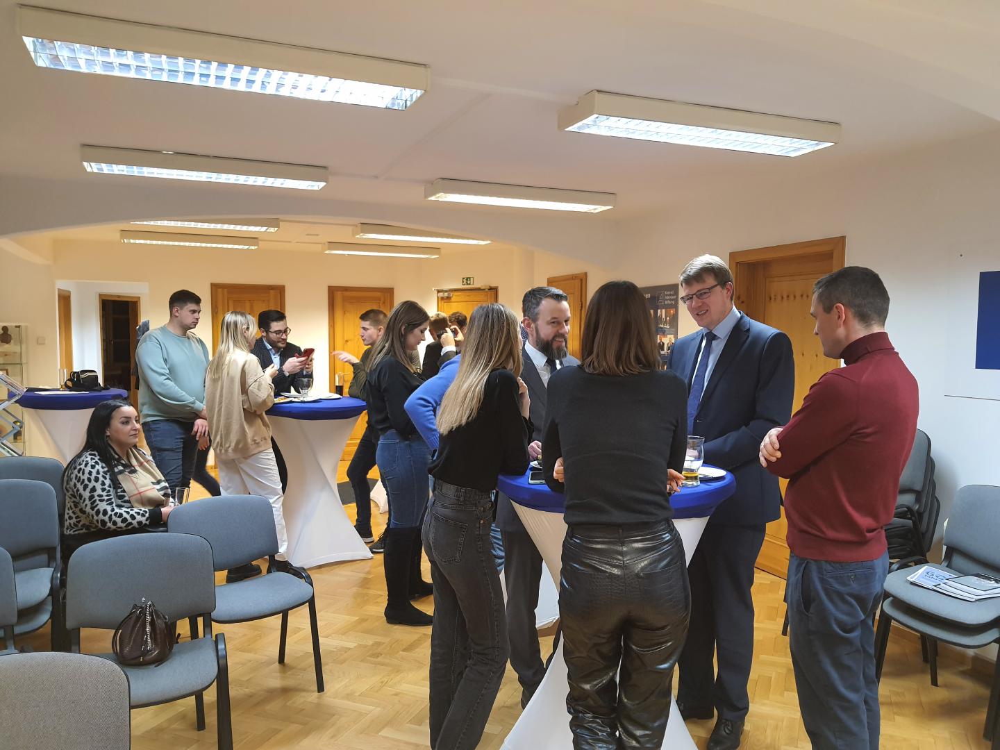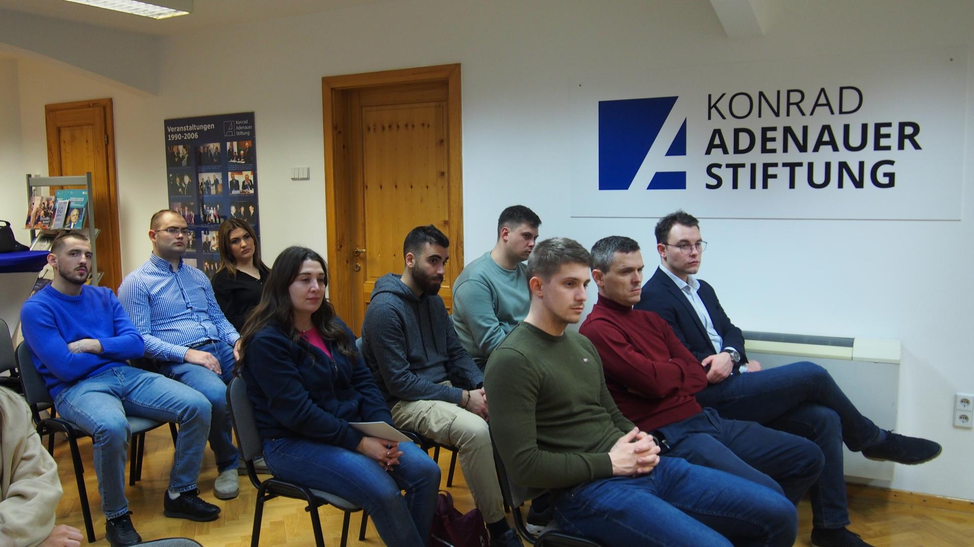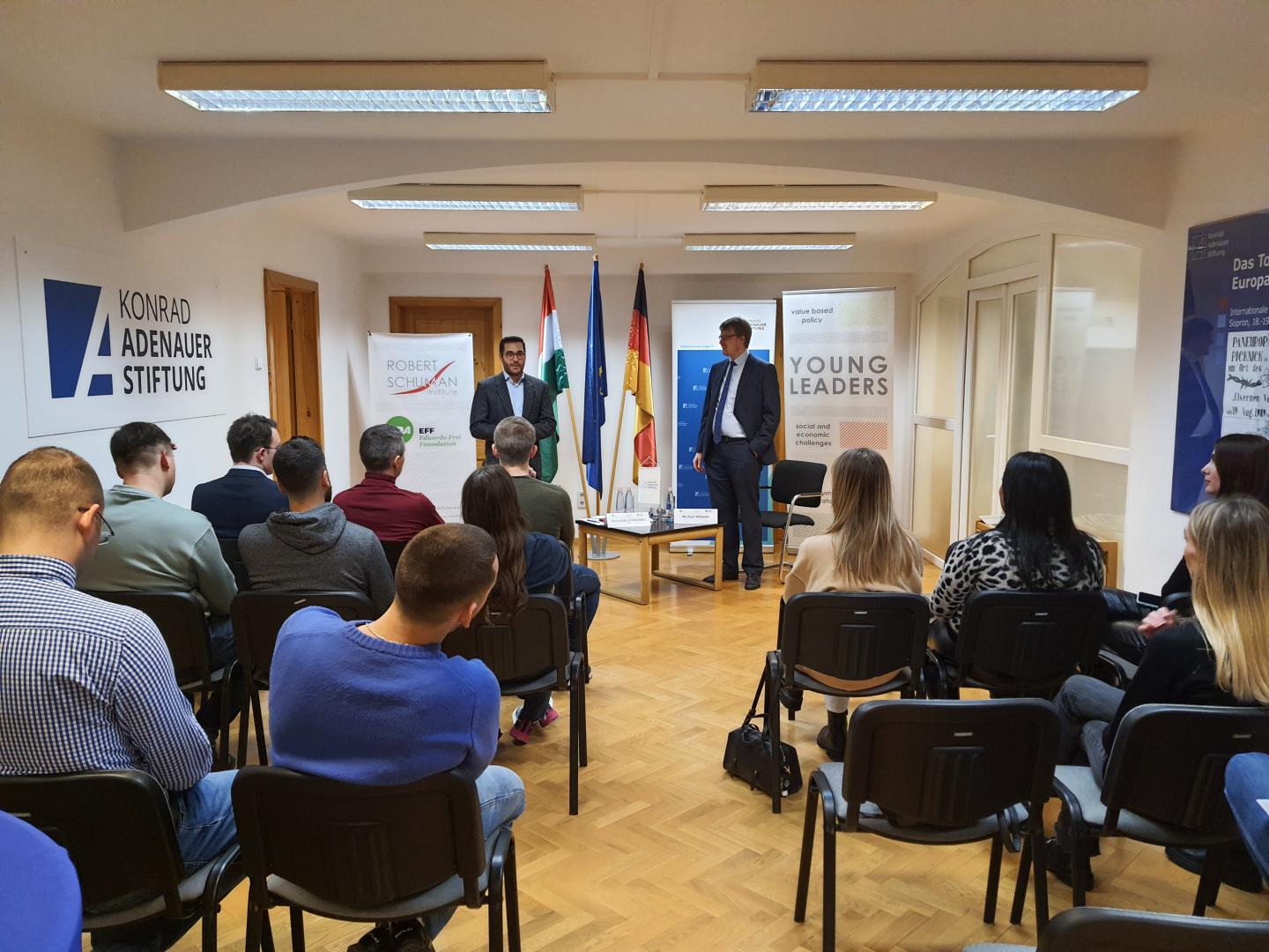 Im Rahmen des einwöchigen Ausbildungskurses des Robert-Schuman-Instituts ("Young Leaders Seminar"), fand am 23. Januar ein Gespräch in dem Auslandsbüro Ungarn der Konrad-Adenauer-Stiftung in Budapest statt. Die mehr als 20 jungen und engagierten Teilnehmenden, die aus mehr als 10 Ländern kamen, hatten die Möglichkeit Herrn Michael Winzer, Leiter des Auslandsbüros der Konrad-Adenauer-Stiftung in Budapest Fragen im Zusammenhang der Arbeit der Adenauer Stiftung in Ungarn und aktuellen politischen Entwicklungen in Ungarn, Deutschland, Europa und der Welt zu stellen. Das Gespräch wurde von Alessandro D’Onofrio, Projektkoordinator des Robert-Schuman-Instituts moderiert. Das junge Publikum hatte große Interesse für die oben genannte Themen gezeigt und die rege Diskussion wurde anschließend in informellen Rahmen fortgesetzt.