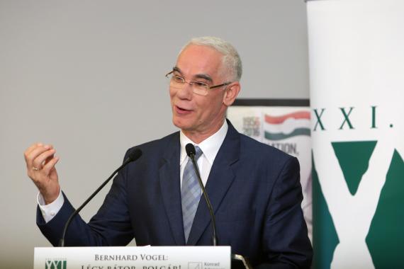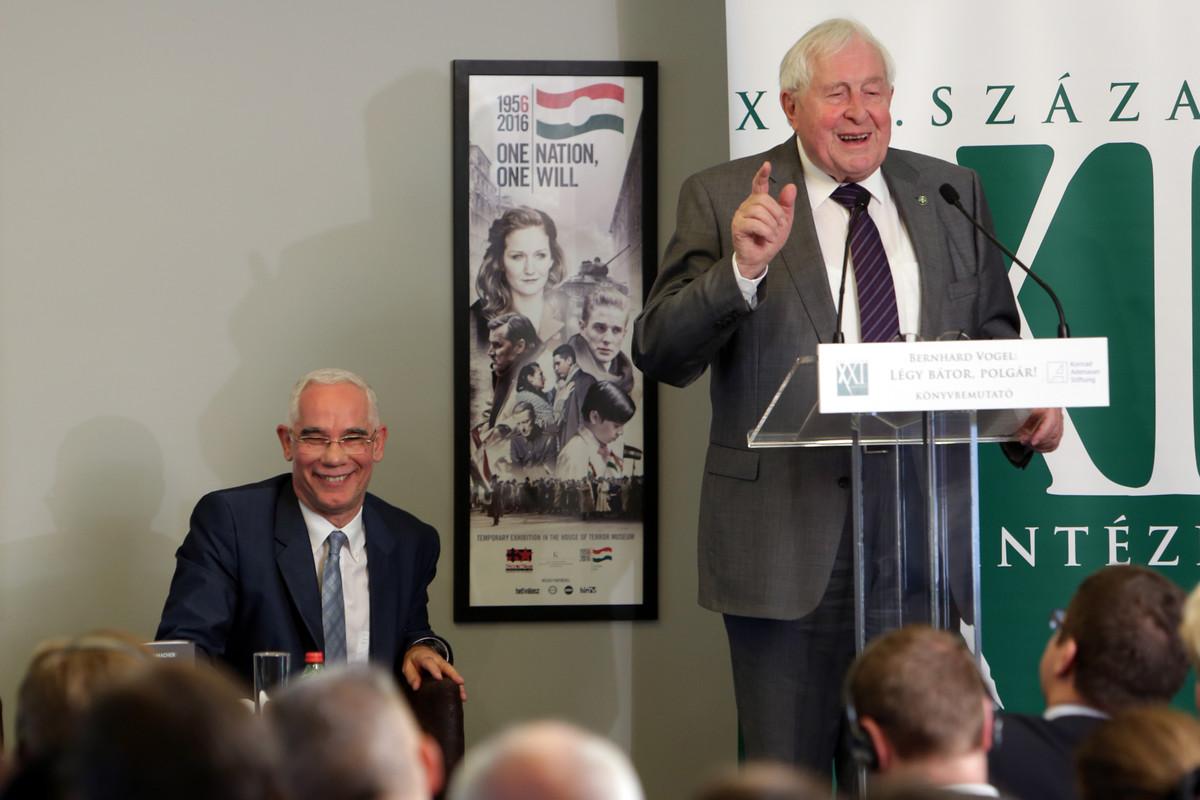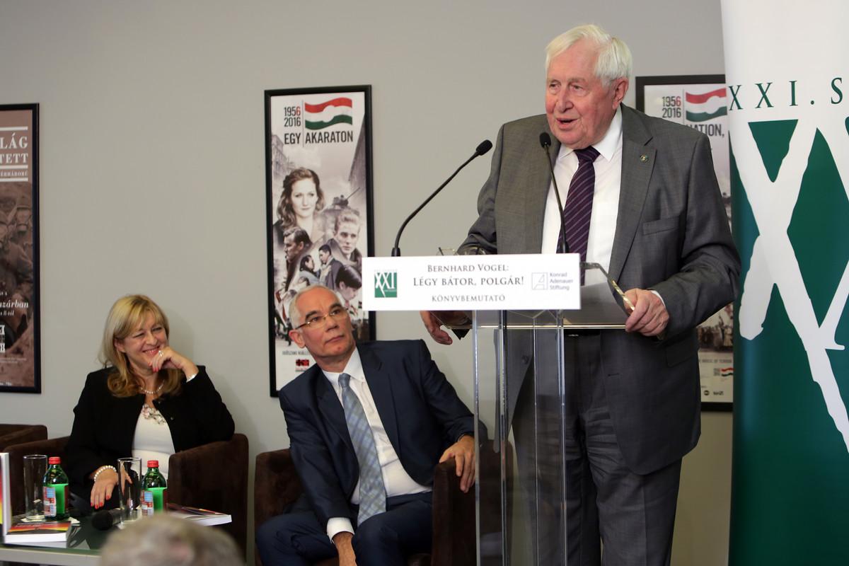 In Vertretung des ungarischen Ministerpräsidenten, der zur Beisetzung von Schimon Peres kurzfristig nach Israel reiste, hielt Zoltán Balog, Minister für Humanressourcen, die Laudatio. Er zeigte sich besonders von der anhaltenden Aktualität des Buches beeindruckt, obwohl es bereits vor vier Jahren erschienen sei. Die letzten 60 Jahre hätten auch eine Bedeutung für die nächsten 50 Jahre: „Die Geschichte ist der Schulmeister des Lebens. Wenn man die Vergangenheit nicht versteht, hat man keine Chance die Zukunft zu gestalten“, so Minister Balog. Prof. Dr. Vogel ging in seiner Rede auch auf den Unterschied zwischen einem Mut- und Wutbürger – eines der dominierenden Themen seines Buches - ein. Beim Mutbürger stehe das Gemeinwohl im Mittelpunkt, der Wutbürger würde aus purem Egoismus heraus handeln. „Krisen kann man bejammern oder man kann versuchen sie zu meistern. Wenn man sie meistern will, muss man die Ärmel hochkrempeln, muss Hand anlegen und sich engagieren“, so Prof. Dr. Vogel. Hinsichtlich der Frage der europäischen Zukunft zeigte er sich überzeugt, dass „wir in der zukünftigen Welt nicht als Portugal oder Schweden, als Nationalstaaten, sondern nur als Europa eine Zukunft haben.“