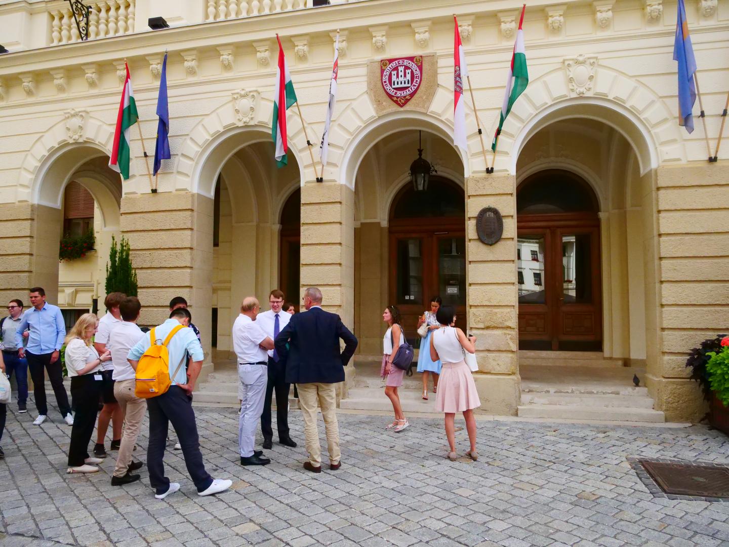 Am Folgetag begrüßte Dr. Ciprián Farkas, Bürgermeister der Stadt Sopron die Teilnehmer der Sommerakademie im Festsaal des Rathauses und erklärte, wie sich die Stadt den Titel ,,Civitas Fidelissima“ erworben hatte und wie sie mit der Grenzöffnung im Jahr 1989 zur Stadt der Freiheit wurde. Der Bürgermeister möchte im Rahmen der Feier unterstreichen, dass eine freiheitsliebende Nation die Freiheit eines freiheitsliebenden Volkes ermöglichte. Des Weiteren käme es auf die Jugend drauf an mit den Zeitzeugen zu sprechen, um die Authentizität der Geschichte greifen zu können. Im Anschluss der Rede des Soproner Bürgermeisters bekamen die Teilnehmer der Sommerakademie einen geschichtsträchtigen Rundgang durch die Stadt, geleitet von Magdolna Krisch, Vorsitzende der deutschen Selbstverwaltung Sopron / Ödenburg.