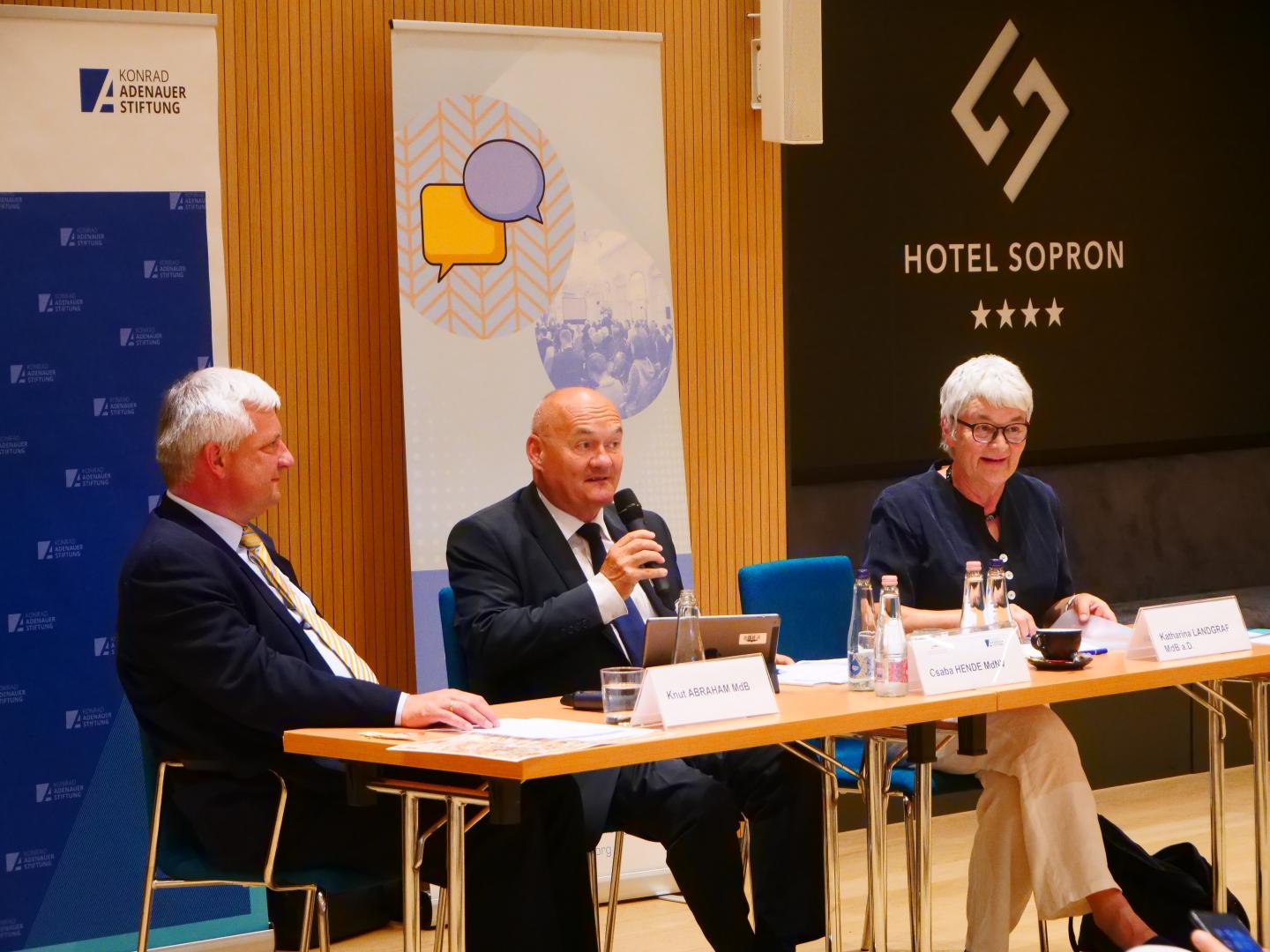 Im Rahmen eines Paneldiskussions über die Zukunft der deutsch-ungarischen Beziehungen vor dem Hintergrund des Paneuropäischen Picknicks mit Knut Abraham MdB und Dr. Csaba Hende MdNV, Vizepräsident der Ungarischen Nationalversammlung, moderiert von Katharina Landgraf MdB a.D., Stellv. Vorsitzende des Deutsch-Ungarischen Jugendwerks wurden vor allem die Unterschiede und Gemeinsamkeiten beider Länder diskutiert und erörtert. Nach Dr. Hende MdNV, könne man heute froh sein in einem demokratischen System zu leben und die Anklage gegenüber dem System sei für ihn eine persönliche Beleidigung. Knut Abraham MdB ist sich der Sache sicher, dass es ohne das Paneuropäische Picknick, die endgültige Öffnung des Grenzzauns am 10. und am 11. September 1989 nicht gegeben hätte. Dr. Csaba Hende MdNV kann anhand des Paneuropäischen Picknicks in der Retrospektive den Teilnehmenden raten sich in der deutsch-ungarischen Beziehung die Verhältnisse selbst vor Ort zu studieren, um sich ein Bild machen zu können. Dazu gehöre sich gegenseitig zu respektieren und sich den Aufgaben gemeinsam zu widmen. Dem kann Knut Abraham MdB nur zustimmen, da es genug gemeinsame Substanzen anhand des Picknicks für beide Länder gebe.