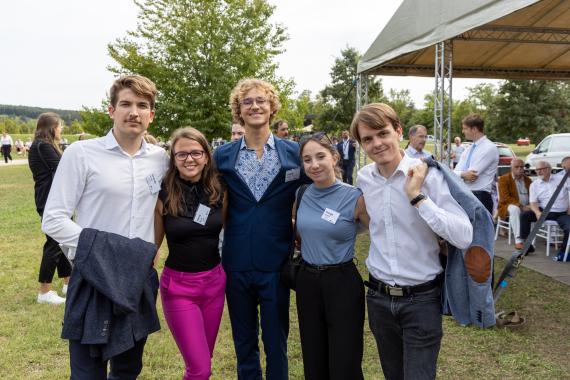 Nach dem Mittagessen fand im Liszt-Ferenc-Konferenzzentrum die feierliche Preisverleihung des Essaywettbewerbs statt, an der auch die beiden Staatsoberhäupter Frank-Walter Steinmeier und Tamás Sulyok teilnahmen. Hier hatten die Jugendlichen die Möglichkeit, sich ein bisshen mit den beiden Präsidenten informell zu unterhalten. Das offizielle Programm endete mit Teilnahme an der offiziellen Gedenkveranstaltung im Gedenkpark des Paneuropäischen Picknicks an de ungarisch-österreichischen Grenze.  Die Gedenkveranstalung wurde von Herrn Ciprián Farkas, dem Bürgermeister der Stadt Sopron eröffnet, der in seiner Rede die Tapferkeit der damaligen Initiatoren des „Picknicks“ würdigte, und sagte dass „Ein gefangenes Volk half, ein anderes gefangenes Volk zu befreien“. Auf dem Podium folgte ihm Tamás Sulyok, Staatspräsident von Ungarn. Herr  Sulyok lobte den Geist des Paneuropäischen Picknicks und betonte, dass er sich wünscht, dass wir alle in ganz Europa dem Geist des Paneuropäischen Picknicks treu bleiben und keinen physischen oder geistigen Stacheldraht mehr zwischen uns errichten lassen.
