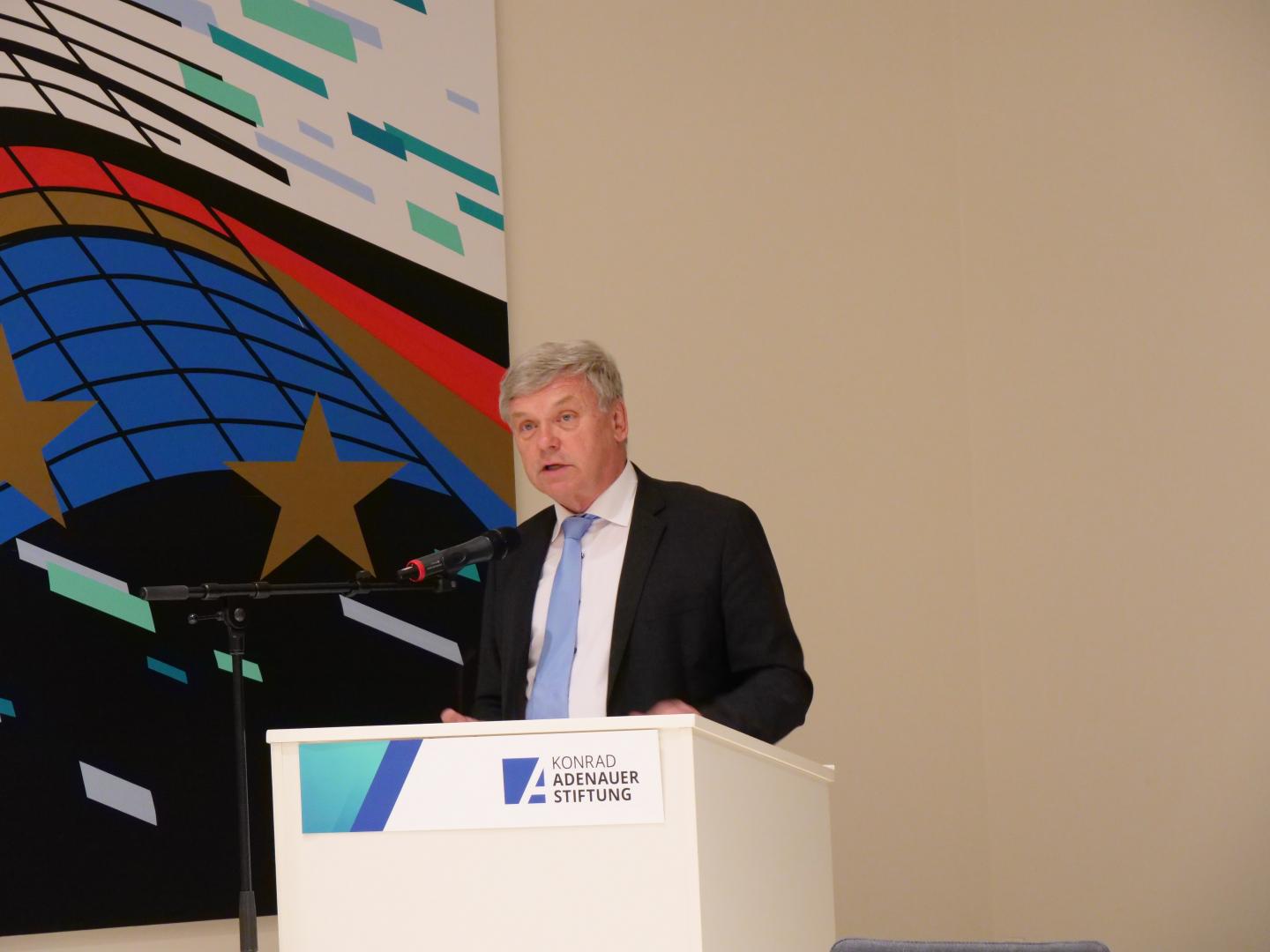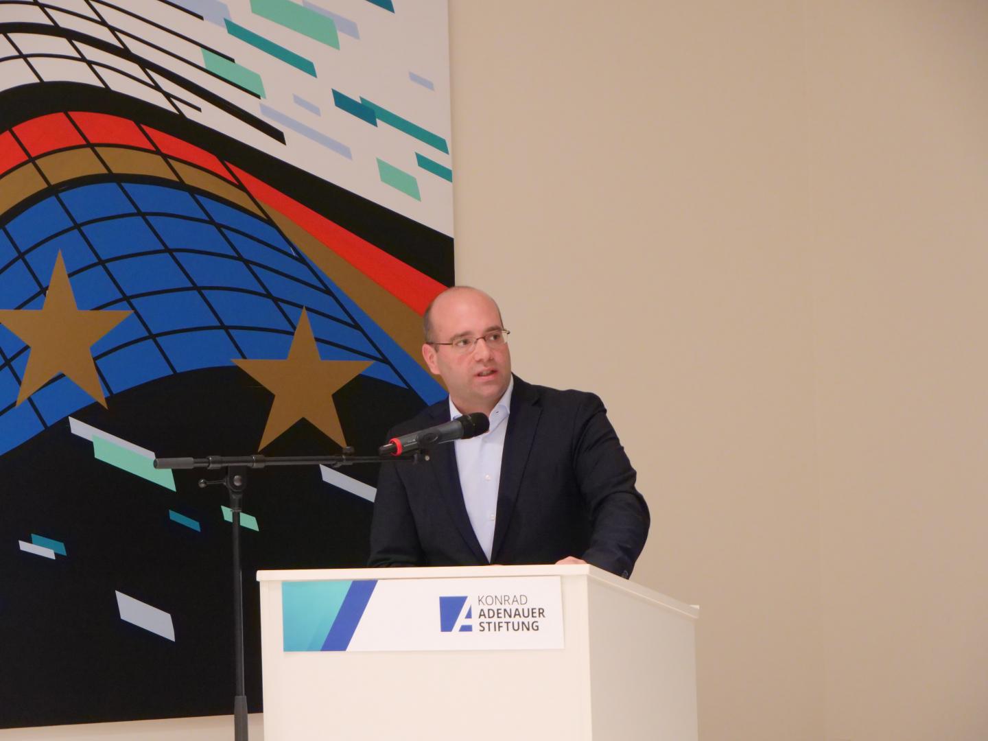 Frank Priess, stellvertretender Leiter der Hauptabteilung Europäische und Internationale Zusammenarbeit der Konrad-Adenauer-Stiftung, eröffnete die Veranstaltung und hieß die Gäste herzlich willkommen. In seiner Begrüßungsrede betonte er die Bedeutung solcher Veranstaltungen und Umfragen für den bilateralen Dialog und verwies auf aktuelle Herausforderungen aber auch Chancen in den deutsch-ungarischen Beziehungen. Studien wie das „Deutsch-Ungarische Barometer“ leisteten, laut Priess, einen bedeutenden Beitrag zur Versachlichung der Debatte um den Zustand der deutsch-ungarischen Beziehungen.