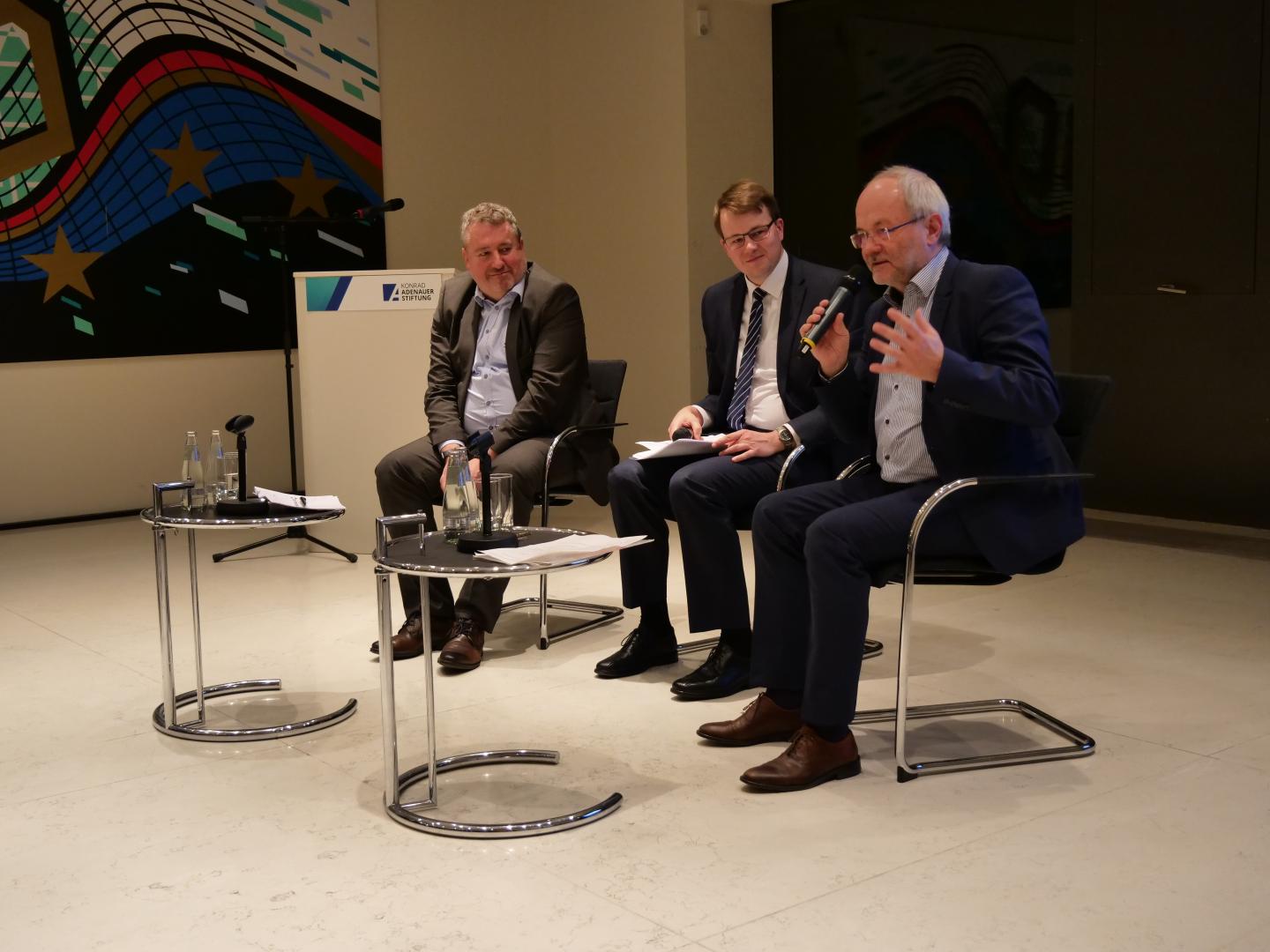 An der anschließenden Podiumsdiskussion zur Bewertung und Interpretation der Ergebnisse nahmen sowohl Dr. Péter Györkös, Botschafter Ungarns, als auch der Bundestagsabgeordnete Volkmar Klein teilnahm. Michael Winzer, Leiter des Auslandsbüros Ungarn der Konrad-Adenauer-Stiftung, moderierte das Panel. In der folgenden Diskussion wurden primär die Auffälligkeiten des diesjährigen Meinungsbarometers näher betrachtet und der Frage nachgegangen, welche Faktoren das Meinungsbild der Bevölkerung maßgeblich beeinflussen. Neben dem Einfluss der medialen Berichterstattung und tagespolitischer Ereignisse wurde in erster Linie die persönliche Erfahrung als ausschlaggebender Faktor herausgestellt. Diese Hypothese deckte sich auch mit den Resultaten der Studie, da eine bessere Kenntnis des anderen Landes meist mit einer positiveren Einschätzung korrelierte. Die Rolle der medialen Berichterstattung wurde ausführlich diskutiert und besonders Botschafter Györkös bemängelte die Berichterstattung über Ungarn, die seiner Ansicht nach oft einseitig sei. Es sei, so Györkös, ein bedauernswerter Umstand, dass sich die mediale Berichterstattung fast ausschließlich auf die politischen Konflikte zwischen den Regierungen beider Länder konzentriere, wohingegen die ausgezeichnete bilaterale Zusammenarbeit in den Bereichen der Wirtschaft, Rüstungspolitik oder auch die Bestrebungen zur Förderung der europäischen Souveränität in den Medien kaum bis gar keine Beachtung fänden. Volkmar Klein zeigte sich vor allem bezüglich der Russlandpolitik Ungarns besorgt und befürchtete, dass die zurückhaltende Positionierung der ungarischen Regierung auch auf traditionell ungarnfreundliche Kräfte in Deutschland befremdlich wirken könnte. Die gegenseitige Wahrnehmung einer Schwächung von Bürgerechten und Medienfreiheit im jeweils anderen Land stelle, so Klein, ebenfalls eine besorgniserregende Entwicklung zwischen zwei EU-Mitgliedstaaten dar. Im Anschluss an die Podiumsdiskussion wurde die Runde für Fragen und Anmerkungen aus dem Publikum geöffnet.