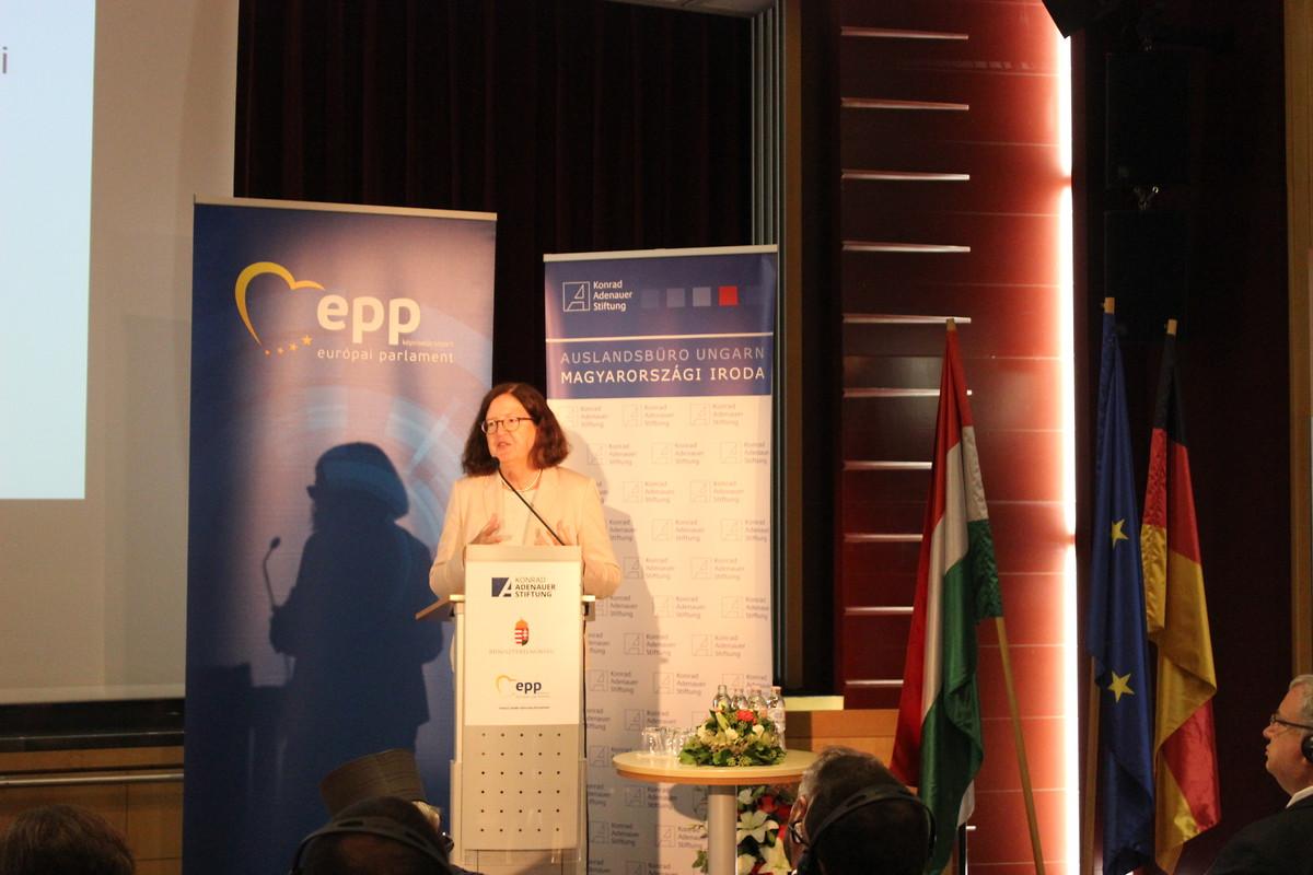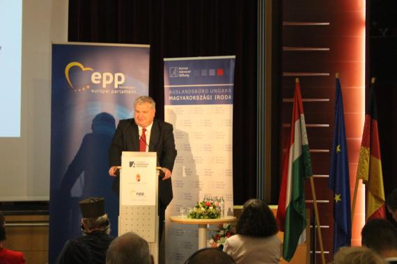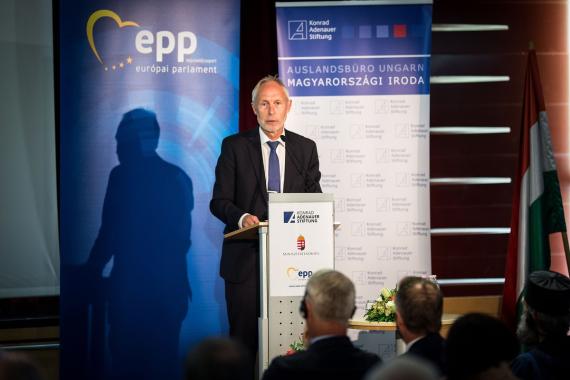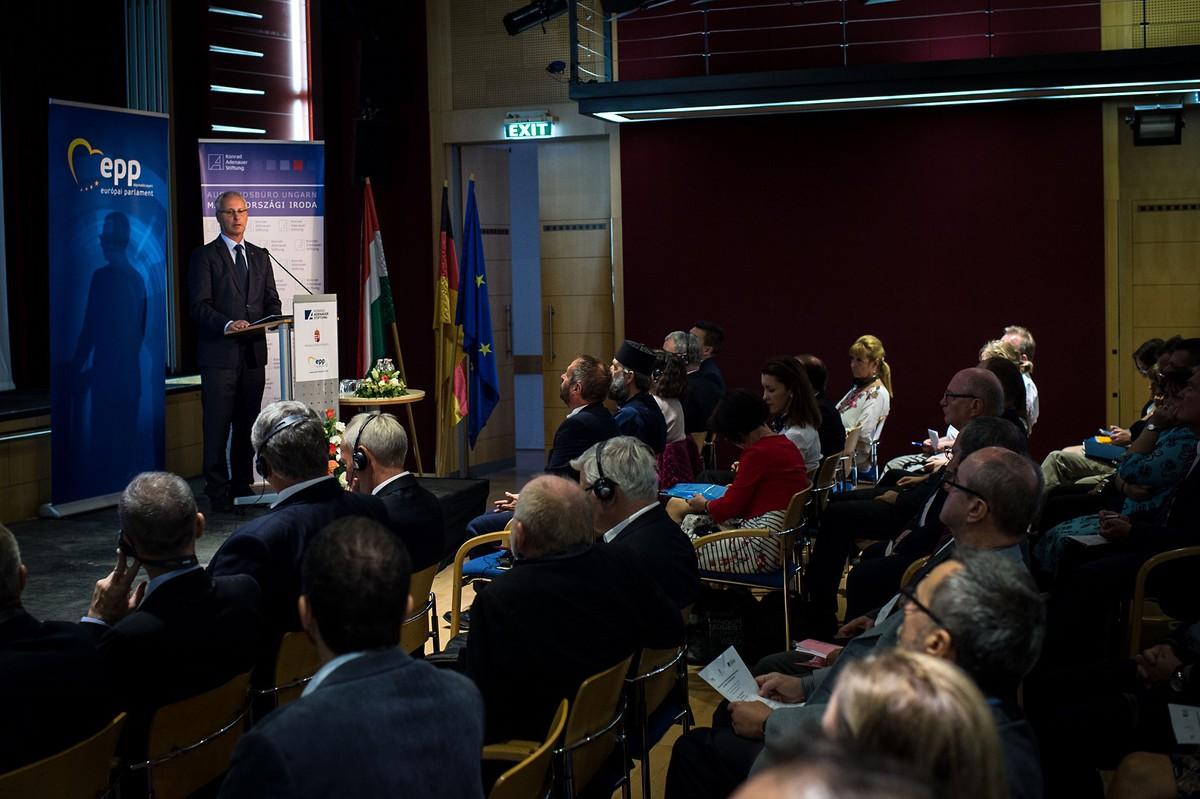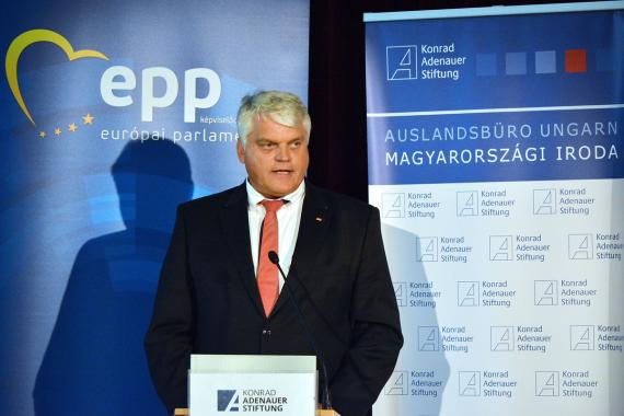 Markus Grübel, Mitglied des Deutschen Bundestags und Beauftragter der Bundesregierung für weltweite Religionsfreiheit, kritisierte in seiner Rede die oft unterschätzte Bedeutung von Religionsfreiheit. Rund 75 Prozent aller Menschen weltweit, insbesondere Christen, seien Opfer eingeschränkter oder nicht vorhandener Religionsfreiheit, so Grübel. Als besonders besorgniserregend bezeichnete er die zunehmende Tendenz zur Einschränkung von Religionsfreiheit, die Grübel am Beispiel der Christen veranschaulichte: „2007 wurden Christen in 107 Ländern verfolgt. Im Jahr 2016 waren es schon 144 Länder; in nur 10 Jahren, einer Dekade, eine Zunahme von fast 40 Prozent.“ Vor dem Hintergrund der Religionsfreiheit betonte Grübel die Notwendigkeit eines „friedlichen Nebeneinanders und Miteinanders“ der Konfessionen zur Minderung von Fluchtursachen einerseits und die Möglichkeiten der gemeinsamen Entwicklungszusammenarbeit Deutschlands und Ungarns andererseits. Als mögliche Anknüpfungspunkte nannte Grübel die umfangreiche ungarische Expertise in den Bereichen militärisches Sanitätswesen und Wasserversorgung.