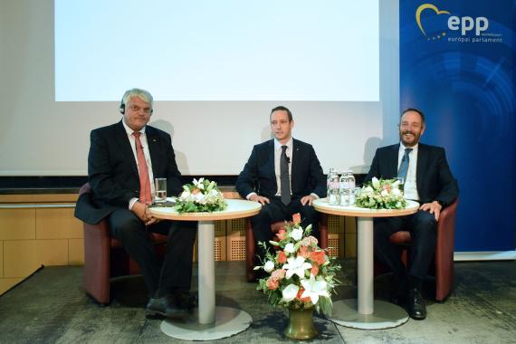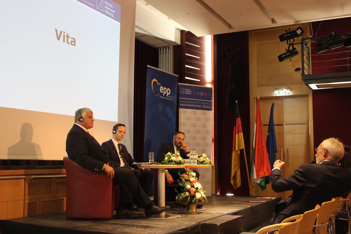 Abschließend fand ein Diskussionsforum mit Markus Grübel MdB, dem designierten Staatssekretär für die Hilfe von verfolgten Christen Tristan Azbej und György Hölvényi MdEP statt. Im Zentrum der Diskussion standen hierbei die Möglichkeiten einer deutsch-ungarischen Kooperation im Bereich der Entwicklungszusammenarbeit. Hölvényi betonte erneut die großen Anstrengungen, die sein Land im Nahen und Mittleren Osten unternehme. Dabei sprach Hölvényi von einem „Pflichtgefühl“ gegenüber verfolgten Christen in diesen Regionen. Aus der Sicht Ungarns liege der Fokus auf der Förderung und dem Schutz des Christentums. Es ginge nicht um eine „Favorisierung“ christlicher Glaubensgruppen, sondern schlichtweg um den Erhalt des christlichen Glaubens im Orient, unterstrich Hölvényi. Im Gegensatz hierzu erklärte Grübel die Notwendigkeit zur Unterstützung sämtlicher Religionsgemeinschaften in den Krisengebieten. Nach Auffassung der Bundesregierung könne aber nicht nur Christen Hilfe geleistet werden. Dies sei in Deutschland „nicht vermittelbar“, so Grübel. Angesprochen auf die Möglichkeiten einer engeren deutsch-ungarischen Entwicklungszusammenarbeit erklärte Grübel, dass insbesondere die Bundesrepublik, aufgrund der Größe des Landes und der vorhandenen Ressourcen, breiter fördern und größeres Engagement leisten könne. Ungarn hingegen, so seine Empfehlung, sollte Entwicklungsarbeit in solchen Sektoren anbieten, in denen das Land über hohe Expertise verfüge.