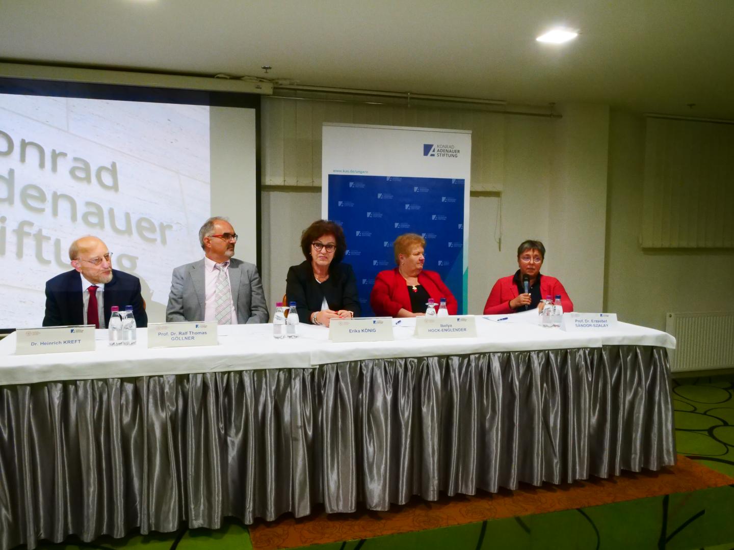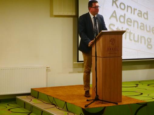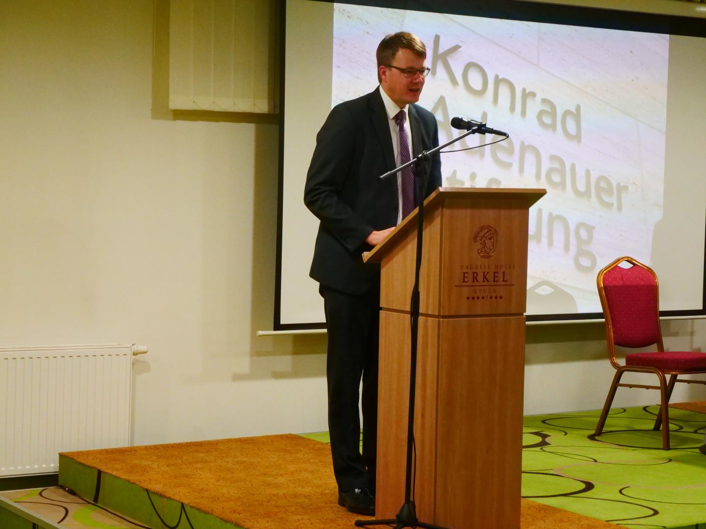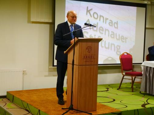 In seiner Eröffnungsrede stellte Dr. Heinrich Kreft, Inhaber des Lehrstuhls der Diplomatie, Leiter des Zentrums für Diplomatie, AUB die Rolle der Minderheiten an der Andrássy Universität innerhalb der Forschung in den Vordergrund. Aus wissenschaftlicher Perspektive sei es für die fortschreitenden Beziehungen der Länder von immenser Wichtigkeit. Michael Winzer, Leiter des Auslandsbüros Ungarn der KAS, ist im Namen der Konrad-Adenauer-Stiftung von der wichtigen Rolle, die die Minderheiten im Mitteleuropa für die europäische Integration und den bilateralen Dialog spielen, überzeugt. Diese wichtige Rolle der Minderheiten belebe die Politik sowie die Bürgergesellschaft, das sei bei der Mitgestaltung der Politik relevant und diene als einer Art Demokratiebarometer. Für die Konrad-Adenauer-Stiftung sind die Themen der Minderheiten eine Herzensangelegenheit, die in Zukunft anhand von weiteren Veranstaltungen weitergeführt wird, da die Minderheitenarbeit Friedensarbeit sei.