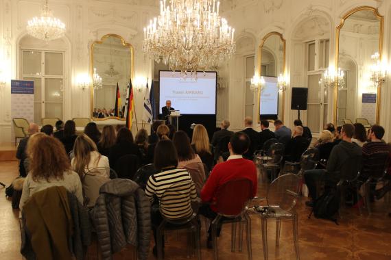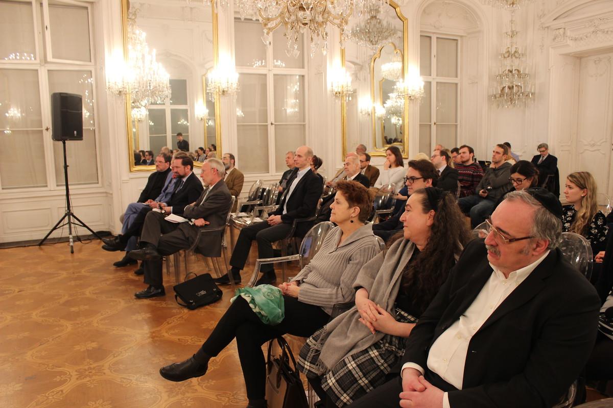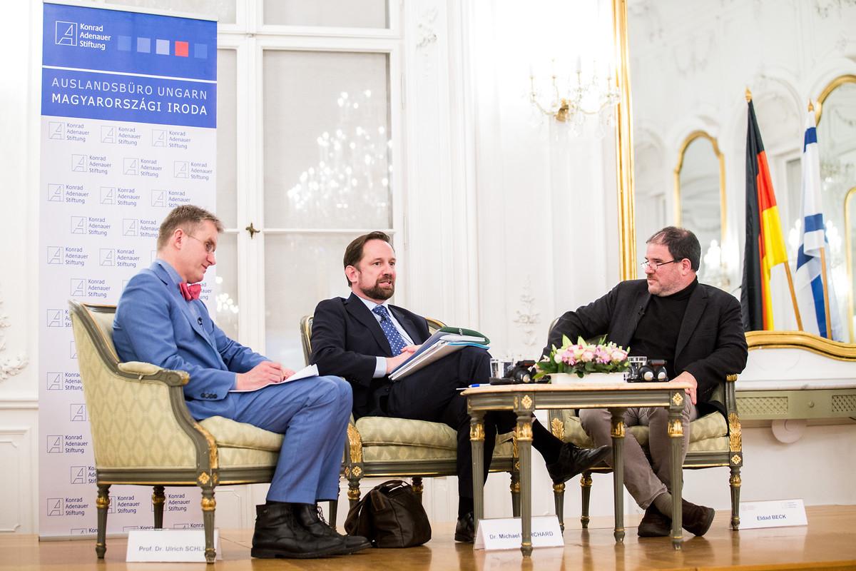 Der israelische Botschafter in Ungarn, Yossi Amrani, hielt ein Grußwort. Prof. Dr. Ulrich Schlie, Inhaber des Lehrstuhls für Diplomatie Andrássy Universität Budapest, moderierte.
