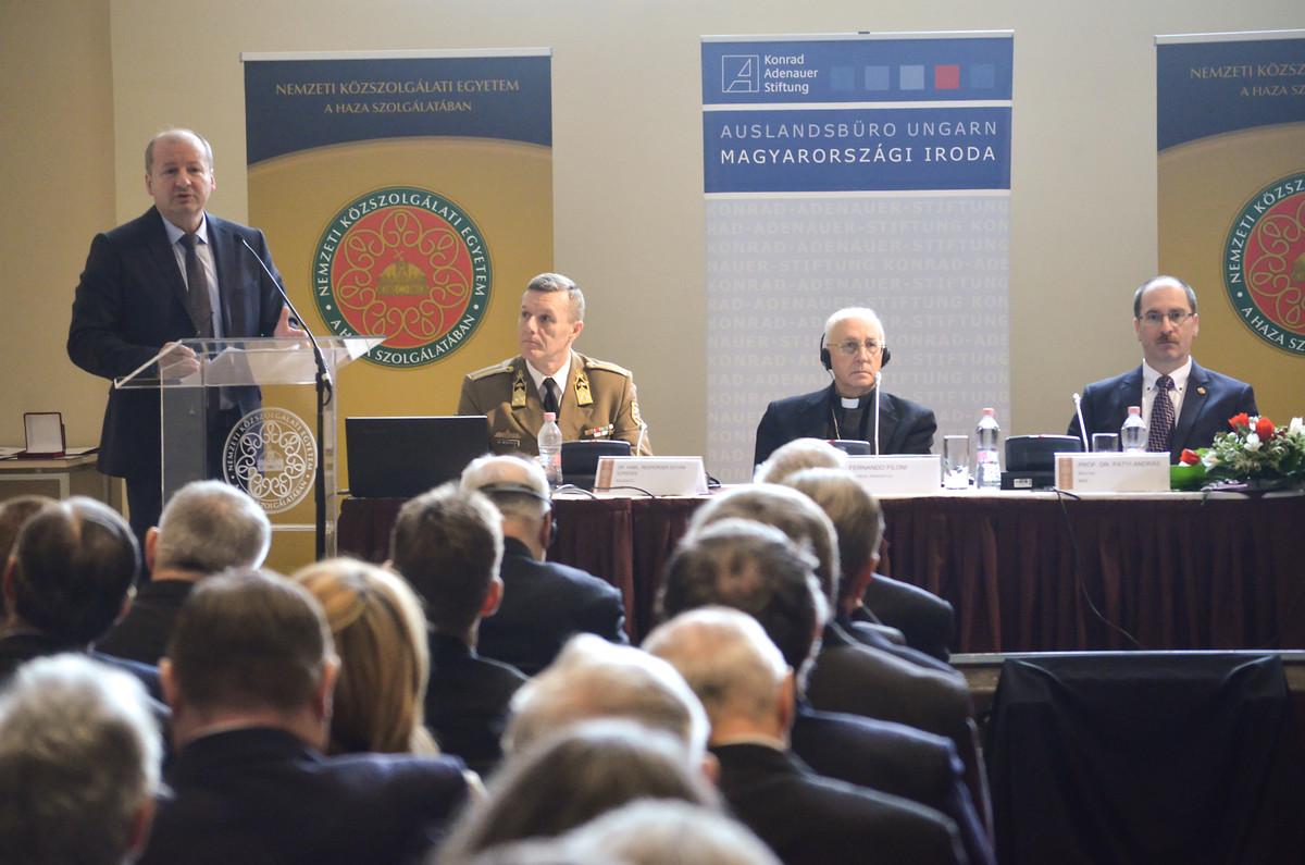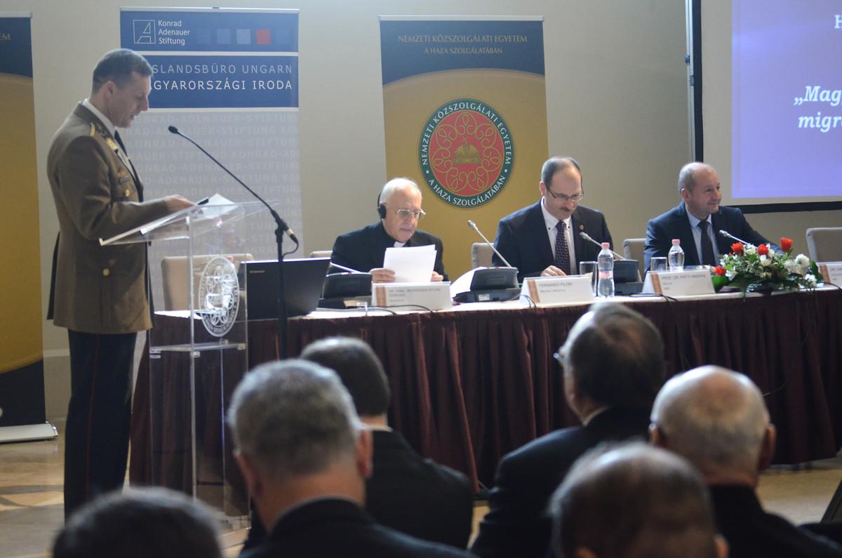Nach einer Kaffeepause sprach Leutnant Dr. Béla Jungbert über die Lage der Christen in Palästina, die dort „unter einem kalten Frieden zu leiden haben“. Dr. Zsuzsanna Végh, Generaldirektorin des Amtes für Migration und Nationalität, referierte über die ethnischen Hintergründe der Menschen, die in Ungarn Asyl suchten. Auf die Rolle der islamischen Gemeinschaft bei der Integration der Flüchtlinge ging Zoltán Sulok, Präsident der Ungarischen Islamischen Gemeinschaft, sowie Generalmajor Sándor Fucsku ein. Laut Sulok müsse man berücksichtigen, dass es keine alleinige islamische Lehre gebe und es auch zwischen muslimischen Einwanderern häufig zu Spannungen komme.