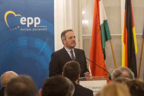 Begrüßt wurden die rund 130 Gäste von Tristan Azbej, Staatssekretär im Ministerpräsidentenamt für die Hilfe von verfolgten Christen, György Hölvényi MdEP, Sprecher der EVP-Fraktion für Entwicklungspolitik sowie Frank Spengler, Leiter des Auslandsbüros Ungarn der Konrad-Adenauer-Stiftung. Gemeinsam betonten sie die aktuelle Relevanz des Themas und die Notwendigkeit gemeinsamer Anstrengungen bei der Bekämpfung von Fluchtursachen. Azbej hob darüber hinaus die entwicklungspolitischen Bemühungen Ungarns im Rahmen des Regierungsprogramms „Hungary Helps” hevor. So habe Ungarn bereits einer Vielzahl von Menschen vor Ort helfen können und insbesondere verfolgte Christen durch verschiedene Maßnahmen unterstützt. Hölvenyi schloss sich diesen Worten an und erklärte, dass in Ungarn seit jeher eine Kultur der Unterstützung vorherrsche und das Land nunmehr bereit sei, auch innerhalb der Entwicklungszusammenarbeit als handelnder Akteur Verantwortung zu übernehmen. Spengler betonte die Rolle der politischen Stiftungen im Rahmen der Entwicklungskooperation. Insbesondere die Konrad-Adenauer-Stiftung sei aufgrund ihrer Verpflichtung zum christlichen Menschenbild bereits seit längerem in diesem Bereich tätig und leiste einen Beitrag zur Koordinierung in der Entwicklungszusammenarbeit.