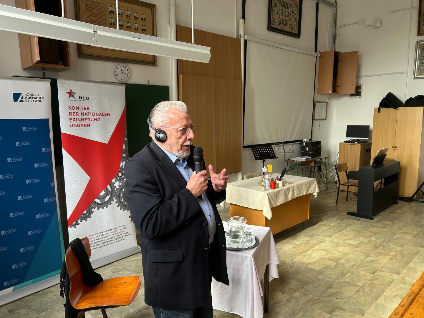 Herr Köhler, der als Protagonist der Geschichte, auf der der Film basiert, und als ehemaliger Klassensprecher der „stillen Klasse” fungierte, sprach während seines Besuchs vom 15. bis 18. Oktober in Sátoraljaújhely und Baja über seine damaligen Erlebnisse. Am 16. Oktober wurde der Film in Sátoraljaújhely im Rahmen einer Fortbildung für Pädagogen mit dem Titel „Nicht nur anschauen, sondern auch nutzen! – Der Platz und die Rolle von Filmen in der Bildung” gezeigt. Anschließend sprach Herr Köhler über die damaligen Ereignisse und beantwortete Fragen. Das Publikum brachte auch relativ neue Themen in die Diskussion ein, wie beispielsweise die Perspektive der Eltern und Lehrkräfte oder die Frage der historischen Fatalität.