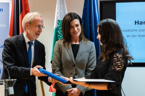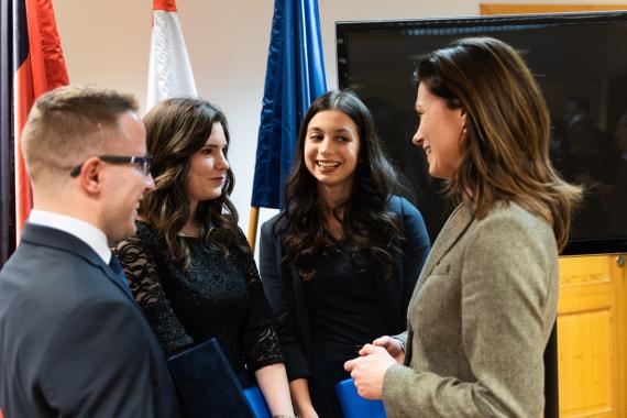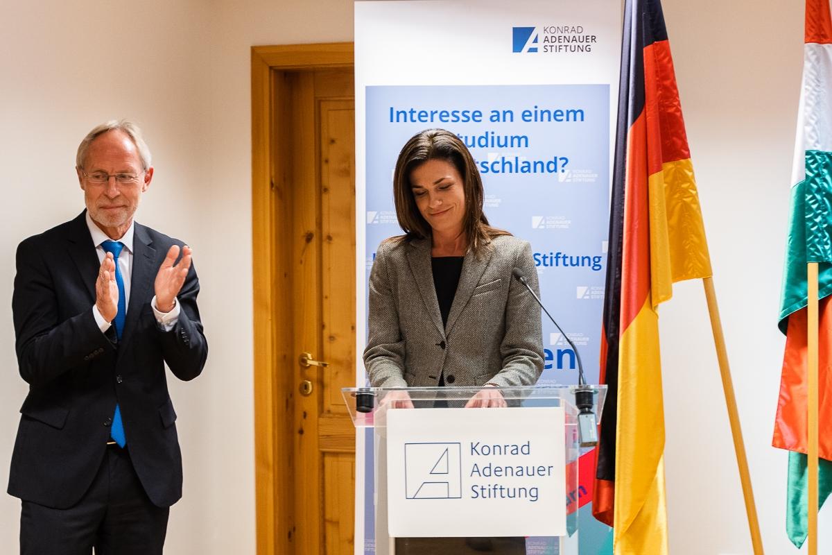 In seinem Beitrag bedankte sich Frank Spengler auch für die langjährige und vertrauensvolle Zusammenarbeit bei den Partnern der KAS Budapest und betonte die wichtige Rolle der kontinuierlichen Pflege und des Ausbaus der deutsch-ungarischen Beziehungen. Justizministerin Judit Varga ging in ihrer Rede auf den hohen politischen Stellenwert der partnerschaftlichen Beziehungen ein. Mit den Worten Konrad Adenauers „Wir leben alle unter dem gleichen Himmel, aber wir haben nicht alle den gleichen Horizont”, wies die Ministerin auf die außergwöhnliche Begabung der Neu-Stipendiaten deutlich hin. Sie bedankte sich für die Einladung und nach der Übergabe der Stipendienurkunden überreichte ihr Frank Spengler nicht nur Blumen, sondern auch eine kleine Holzwasserwaage. Dieses Geschenk solle Sie in schwierigen politischen Situation, symbolisch an „Maß und Mitte” erinnern.