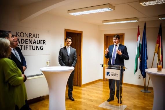 Am Abend des 28. Oktober 2024 fand in den Räumen des Auslandsbüros der Konrad-Adenauer-Stiftung (KAS) in Budapest die feierliche Übergabe der Urkunden für die neuen KAS-Stipendiaten statt. Diese Förderung wird durch eine langjährige Kooperation der Konrad-Adenauer-Stiftung und der Andrassy Universität Budapest (AUB) ermöglicht. Nach der Eröffnung der Veranstaltung durch den Büroleiter Herrn Winzer folgte eine Rede des CDU-Abgeordneten des Deutschen Bundestages, Dr. Christoph Ploß. Dieser weilte, auf Einladung der KAS hin, für drei Tage in Budapest, um an einem politischen Dialog-Programm teilzunehmen. In seiner Rede betonte Herr Dr. Ploß die Bedeutung der EU und der NATO für Wohlstand und Sicherheit in Europa, sowie der deutsch-ungarischen Zusammenarbeit, insbesondere vor dem Hintergrund der derzeitigen EU-Ratspräsidentschaft Ungarns. Als Altstipendiat der Konrad-Adenauer-Stiftung machte Herr Dr. Ploß in seiner Rede auf die Brückenbauerfunktion der neuen Stipendiatinnen und Stipendiaten aufmerksam, die diese zwischen beiden Ländern spielen können.