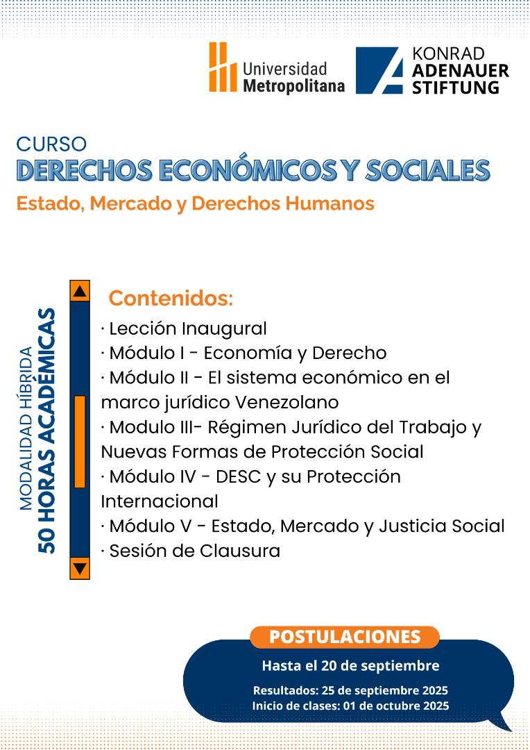Este curso te brindará herramientas teórico-jurídicas para comprender los derechos económicos y sociales, cómo se vinculan con el sistema económico venezolano y cómo el Estado y el mercado interactúan en la vida de las personas.