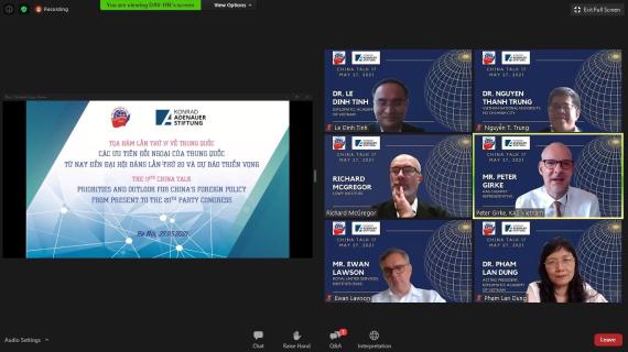 Over the last 5 years, KAS Vietnam has been supporting its partner – Diplomatic Academy of Vietnam organized the China Talk series, and this is now the 17th China Talk with the topic is “Priorities and outlook for China's foreign policy from present to the 20th Party Congress“. This topic was selected in the context that China's communist party is preparing for its 20th Party Congress at the end of the 2022 with multiple issues of interest related to the economy, the pandemic, the relation with the US and their partners… But there is also the question of Xi Jinping's leadership and the question of a possible succession. The main speaker for China talk 17 is Richard McGregor, senior fellow at the Lowy Institute, Australia. Richard McGregor is an award-winning journalist and author of many valuable publications. Richard is also known as an expert on China’s political system and the workings and structure of the communist party. The two commentators provided insightful comments over the topic are: 1. Mr. Ewan Lawson, former Senior Research Fellow at the Royal United Services Institute and 2. Dr. Nguyen Thanh Trung, Director, Centre for International Studies (SCIS), University of Social Sciences and Humanities, Vietnam National University ‐ Ho Chi Minh City. Moderator of the event is Dr Le Dinh Tinh, Director General, Institute for Foreign Policy and Strategic Studies, Diplomatic Academy of Vietnam. For the first time, a China Talk has to run completely virtual. Still, it received more than hundred online participants. China Talk series is always one of the greatest joint activities between KAS Vietnam and Diplomatic Academy of Vietnam and it showed that learning and understanding about China seems to be the never ending. The China Talk 18 is expected to be organized in October 2021.