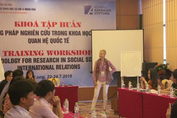 Vom 22. bis 24. Juli 2019 veranstalteten die KAS Vietnam und die Universität für Sozial- und Geisteswissenschaften (USSH) einen Workshop, um das Wissen über Methodik und Methoden in den internationalen Beziehungen und Sozialwissenschaften für junge Forscherinnen und Forscher zu erweitern. Um die neuen Forschungstrends in diesen Wissenschaften angemessen kennenzulernen, luden die Organisatoren zwei Expertinnen des Fachgebiets ein: Assoc. Prof. Dr. Christina Schwenkel von der University of California und Dr. Michaela Boerner von der Friedrich-Schiller-Universität Jena. Die beiden Professorinnen halfen den Teilnehmenden, ihre quantitativen und qualitativen Methoden bei der Durchführung von Recherchen zu verbessern. Zu diesem Zweck organisierten sie einen interdisziplinären Workshop, an dem die Teilnehmenden eigenen Forschungsfragen formulieren und Erfahrungen austauschen konnten. Eines der wichtigsten Themen war die Veröffentlichung von Artikeln in internationalen Fachzeitschriften. Dr. Christina Schwenkel, Mitherausgeberin des Journal of Vietnamese Studies, gab eine Reihe von Insides und Ratschlägen.