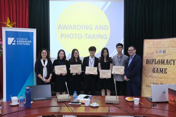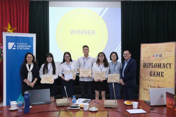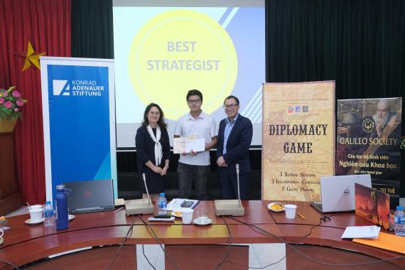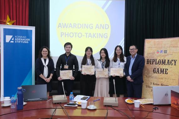 Am vergangenen Sonntag fand die Abschlusssitzung des Diplomacy Game an der Diplomatic Academy of Vietnam (DAV) statt. Die Teilnehmerinnen und Teilnehmer nutzten die Gelegenheit, um sich über ihre Spielstrategien im Umgang mit Verbündeten und Gegnern auszutauschen und ihr Vorgehen im Laufe der Simulation zu diskutieren.