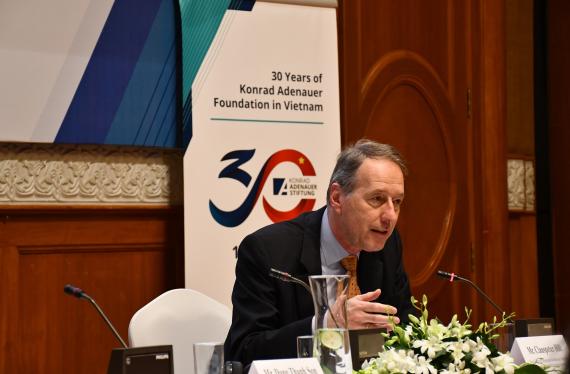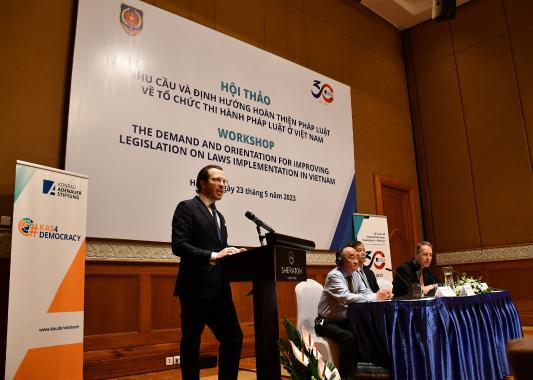 An dem Workshop nahmen zahlreiche Vertreter relevanter Organisationen aus Exekutive, Judikative und Legislative sowie aus insgesamt 37 Provinzen des Landes teil. Auch ein deutscher Gast, Clauspeter Hill, stellvertretender Leiter der Abteilung Europäische und Internationale Zusammenarbeit der Konrad-Adenauer-Stiftung Berlin, nahm persönlich teil. Herr Hill berichtete über die Erfahrungen der Bundesrepublik Deutschland bei der Umsetzung von Gesetzen, die als Referenz für Vietnam dienen können. Er tauschte sich auch mit seinem vietnamesischen Amtskollegen über den Verwaltungsvollzug in Deutschland aus.
