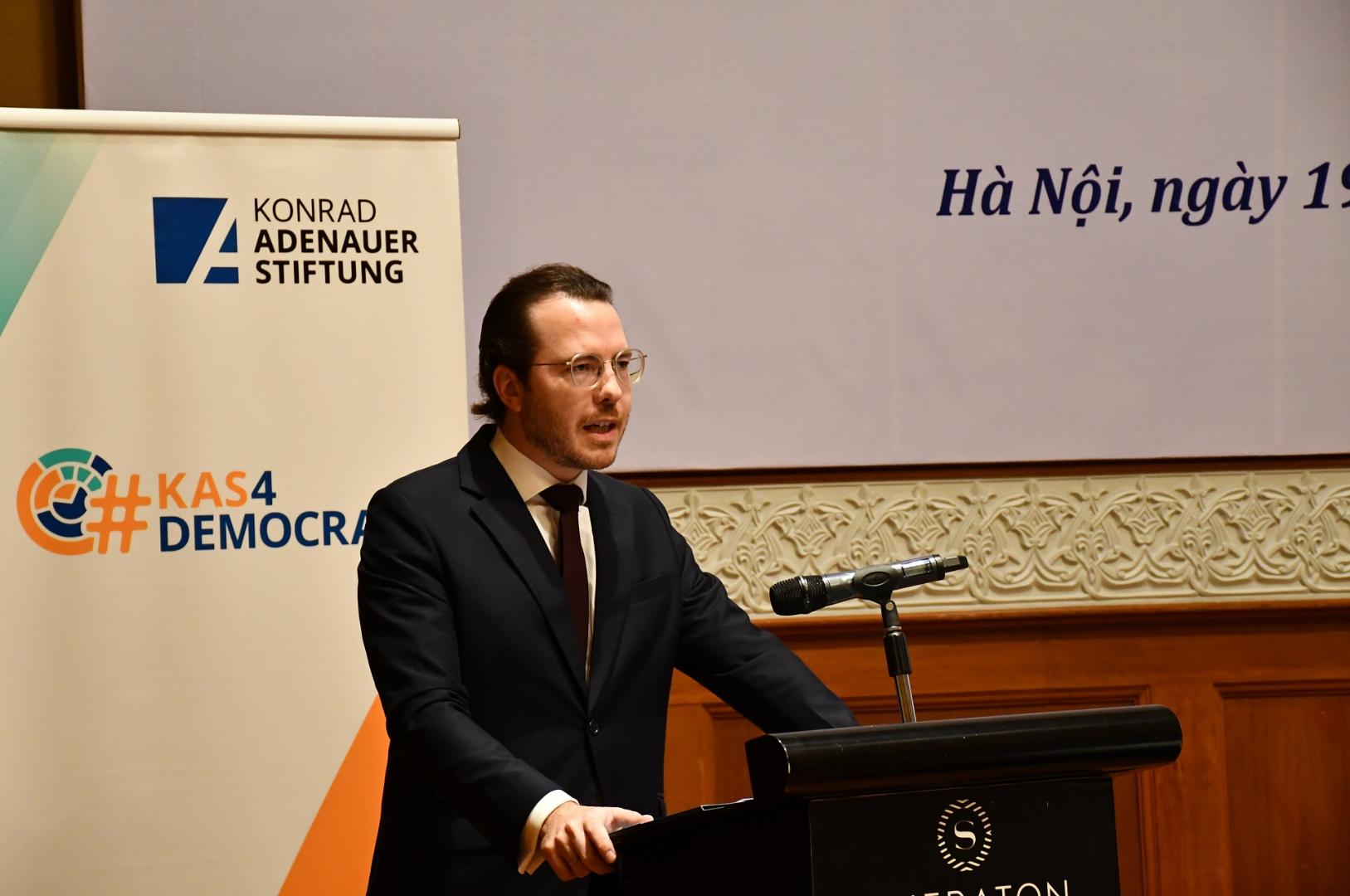 Florian Constantin Feyerabend, Leiter der Konrad-Adenauer-Stiftung Vietnam, wies in seiner Rede darauf hin, dass das politische System und das Verständnis von Rechtsstaatlichkeit in Deutschland und Vietnam erhebliche Unterschiede aufweist. Dennoch könne die Diskussion über das deutsche Verwaltungsrecht möglicherweise einige interessante Kenntnisse für die Ausarbeitung eines Verwaltungsverfahrensgesetzes in Vietnam liefern.