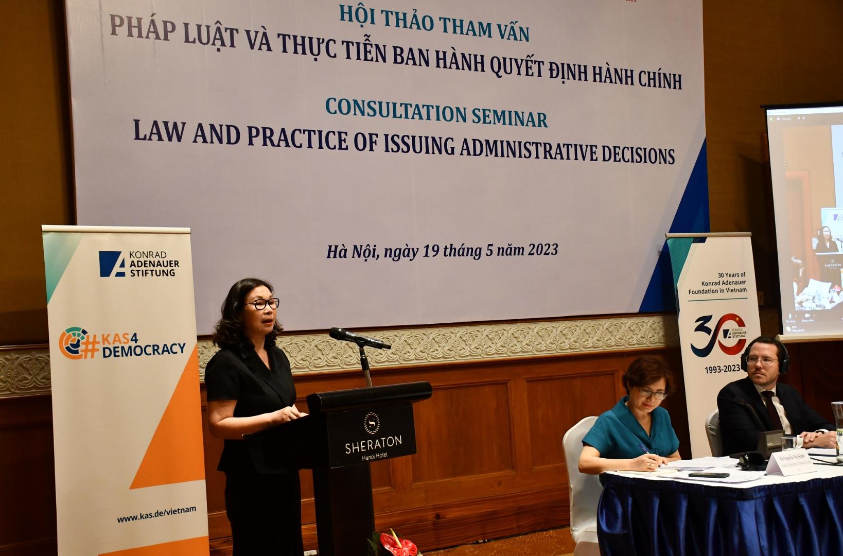 Das Seminar fand im Rahmen des seit 2008 bestehenden bilateralen Rechtsstaatsdialogs zwischen Deutschland und Vietnam statt. Ein renommierter deutscher Experte aus dem Gebiet des Verwaltungsrechts, Herr Klaus Hage, Vorsitzender Richter am Verwaltungsgericht Minden, sprach auf dem Seminar über die Praxis des Erlasses von Verwaltungsakten in Deutschland und erläuterte das deutsche Verwaltungsverfahrensgesetz (VwVfG) und die deutsche Verwaltungsgerichtsordnung (VwGO).