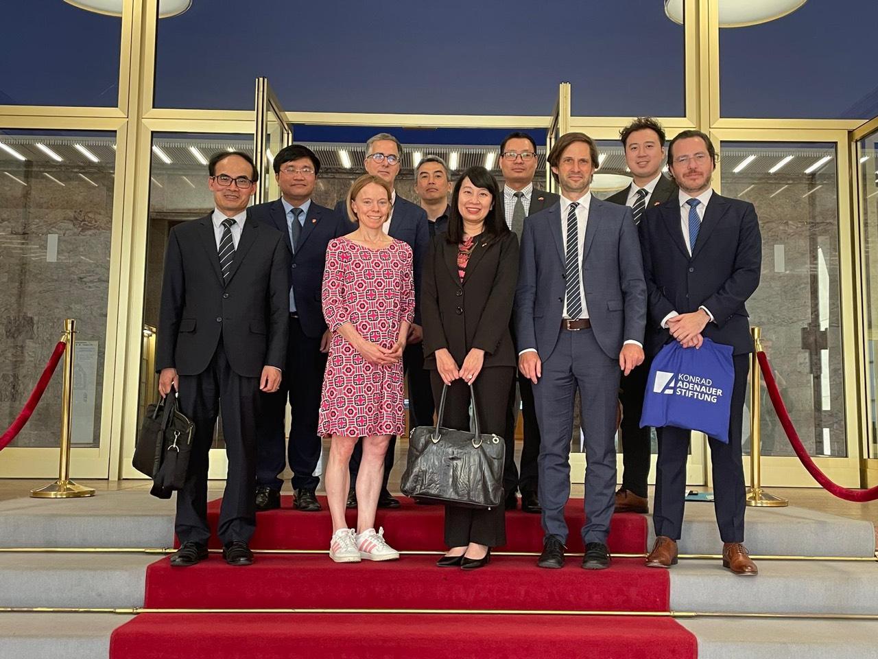 In the latter part of the dialogue program, the delegation visited Berlin, the capital of Germany. They received a warm welcome from the executive leadership of the Konrad-Adenauer-Stiftung. Numerous meetings and expert discussions occurred with MP Gunther Krichbaum, MP Nicolas Zippelius, KAS policy advisors and representatives from the Federal Foreign Office, Federal Ministry of Justice, Federal Ministry of Defence, and German Institute for International and Security Affairs. During these events, discussions centered around economic security, particularly open maritime trade routes, as well as food and environmental security in the Mekong subregion. The dialogue program concluded successfully with a reception hosted by Vietnam’s Ambassador to Berlin.