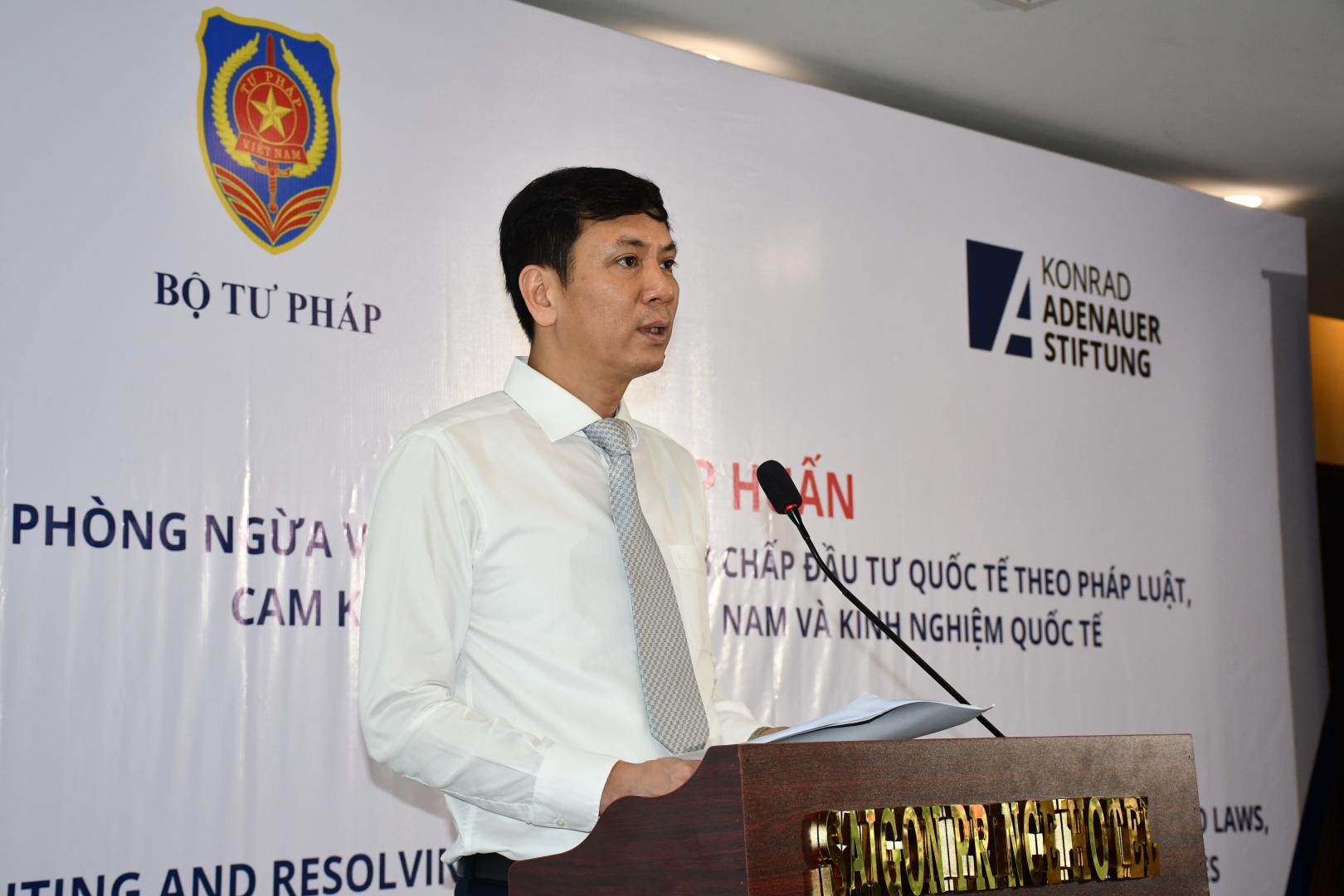 In seiner Eröffnungsrede betonte Herr Nguyen Duc Kien, stellvertretender Generaldirektor der Abteilung für Internationales Recht, dass die Stärkung der Streitbeilegungskapazitäten nicht nur eine wirksame Bearbeitung konkreter Fälle ermöglicht, sondern auch zur Entwicklung eines robusten Rechtsrahmens beiträgt und damit die Grundlage für ein stabiles und nachhaltiges Wachstum des Landes im Kontext der internationalen Integration legt. Zudem teilte Frau Nguyen Minh Tuyen, Büroleiterin der KAS Vietnam, deutsche Praxiserfahrungen bei der Modernisierung von Streitbeilegungssystemen. Sie bekräftigte, dass Transparenz, Rechtssicherheit und verstärkte internationale Zusammenarbeit grundlegende Säulen für den Aufbau eines stabilen, attraktiven und nachhaltigen Investitionsumfelds in Vietnam sind.