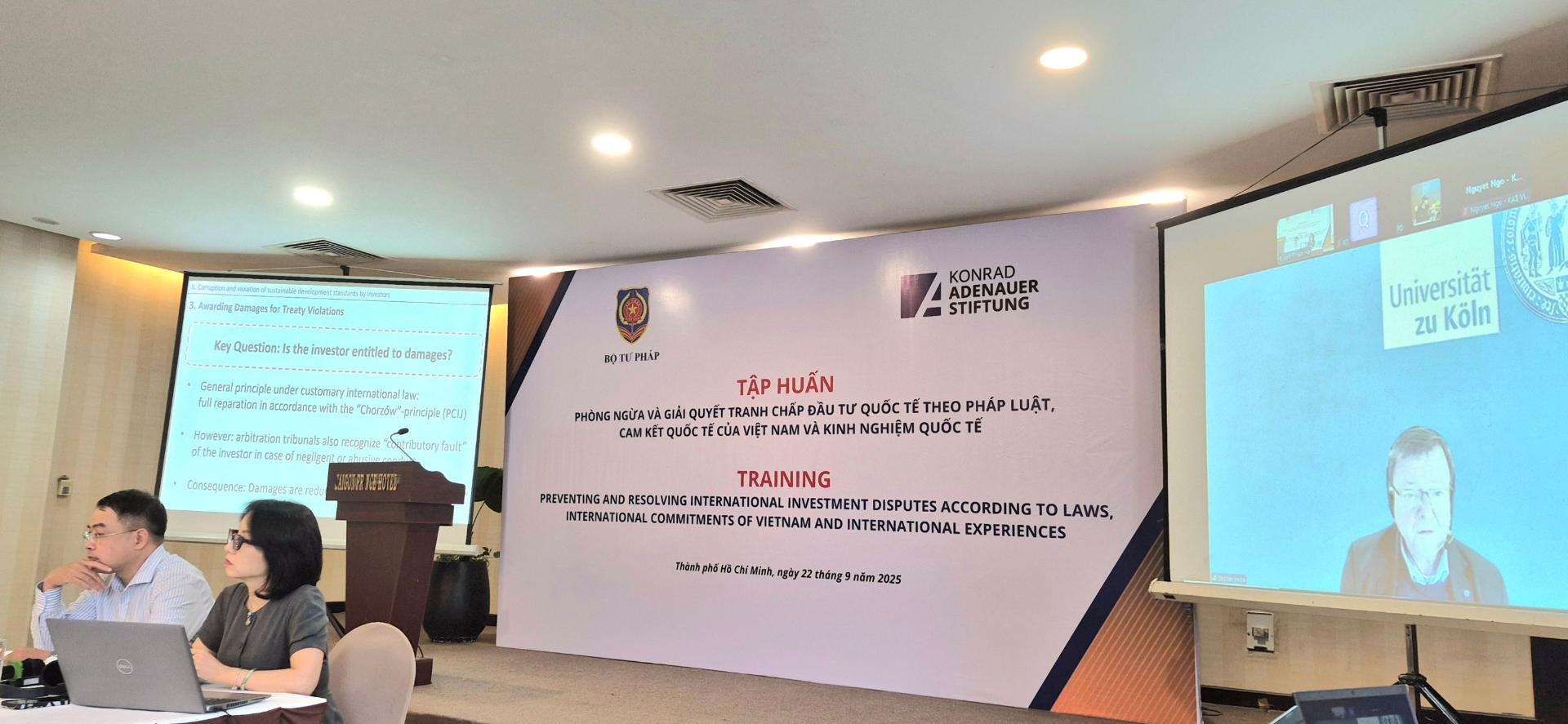 Die Veranstaltung umfasste Vorträge führender Experten, darunter Prof. Dr. Stephan Hobe vom International Investment Law Centre der Universität Köln sowie hochrangiger Vertreter des vietnamesischen Justiz- und Finanzministeriums. Thematisiert wurden unter anderem Investitionsschiedsverfahren bei Korruption und Verstößen gegen Nachhaltigkeitsstandards sowie Streitbeilegungsmechanismen im Rahmen des Investitionsschutzabkommens zwischen der EU und Vietnam (EVIPA).
