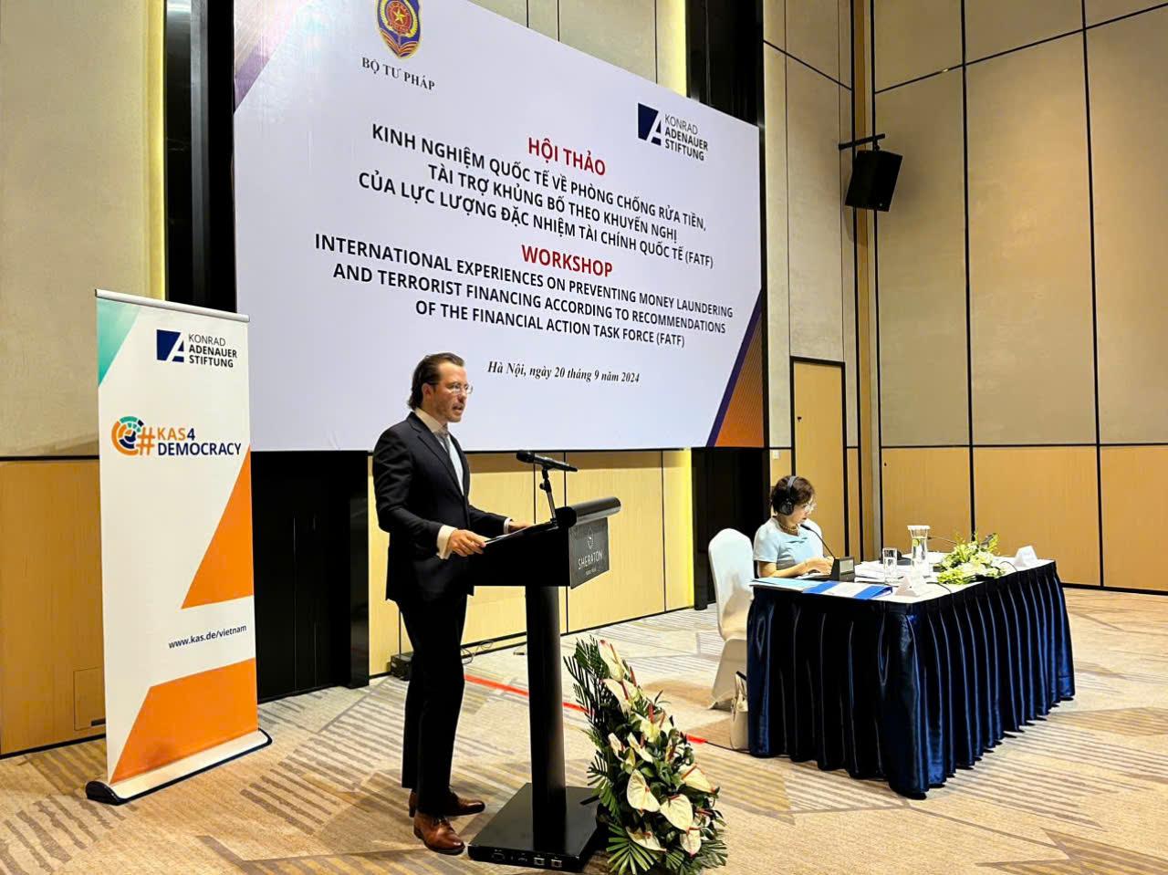 In seiner Ansprache auf dem Workshop betonte Herr Florian Feyerabend, Leiter des Auslandsbüros der Konrad-Adenauer-Stiftung in Vietnam, dass der Austausch von Erfahrungen zwischen den relevanten funktionalen Institutionen zusammen mit internationalen Partnern Vietnam helfen wird, Lösungen zu finden, um sein Strafrecht zu perfektionieren, es effektiver im Kampf gegen Geldwäsche und Terrorismus zu machen und seine FATF-Bewertung zu verbessern.