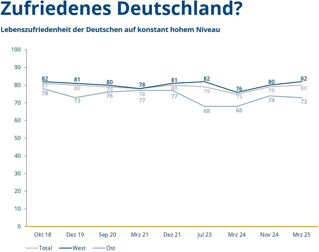 Menschen in Ostdeutschland haben durchschnittlich eine etwas niedrigere Lebenszufriedenheit als Westdeutsche. Zuletzt lag der Anteil der (sehr) lebenszufriedenen Deutschen im Westen bei 82 Prozent, während in Ostdeutschland 73 Prozent alles in allem zufrieden oder sehr zufrieden mit ihrem Leben sind (März 2025).