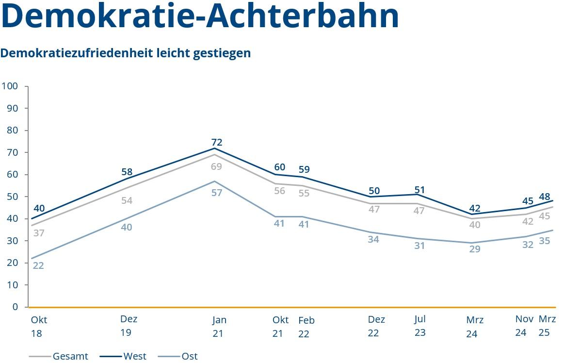 In Ostdeutschland sind die Menschen mit der in Deutschland bestehenden Demokratie weniger zufrieden als die Menschen in Westdeutschland. Im März 2025 sind 48 Prozent der Westdeutschen zufrieden, aber nur 35 Prozent der Ostdeutschen. Der Abstand ist mit 13 Prozentpunkten allerdings etwas kleiner als früher. Zwischen Oktober 2018 und Juli 2023 lag der Abstand meist zwischen 18 und 20 Prozentpunkten.