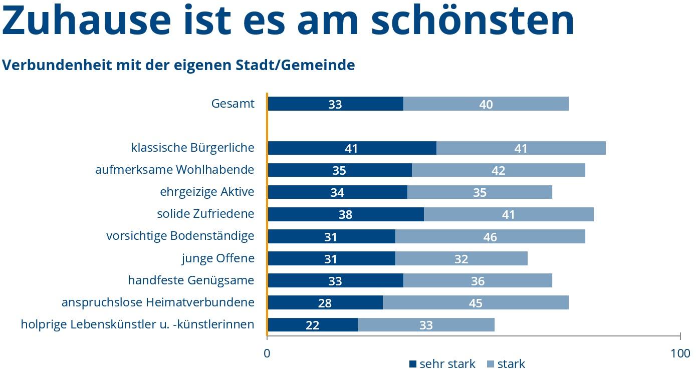 Die ehrgeizigen Aktiven und die jungen Offenen sind bei ihrer Verbundenheit mit der eigenen Region ebenfalls etwas zurückhaltender. Beide Typen sind recht offen für Veränderungen und unterscheiden sich in ihren Möglichkeiten und der Bereitschaft, sich etwas zu leisten. Die wenig veränderungsoffenen Typen (klassische Bürgerliche, solide Zufriedene und handfeste Genügsame) fühlen sich dagegen vergleichsweise stark verbunden mit ihrer Heimat. Dies gilt auch für einen der Typen mit moderater Offenheit für Veränderung. Die anspruchslosen Heimatverbundenen fühlen sich stärker mit ihrer Stadt oder Gemeinde verbunden als die anderen beiden Typen mit mittlerer Veränderungsorientierung (vorsichtige Bodenständige und aufmerksame Wohlhabende). Hier zeigt sich die Heimatverbundenheit, die sie im Namen tragen.