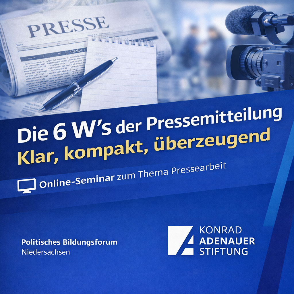 Bitte beachten Sie die AGB´s der Konrad-Adenauer-Stiftung. Der Link zum Online-Raum wird Ihnen nach erfolgreicher Anmeldung, kurz vor der Veranstaltung zur Verfügung gestellt.