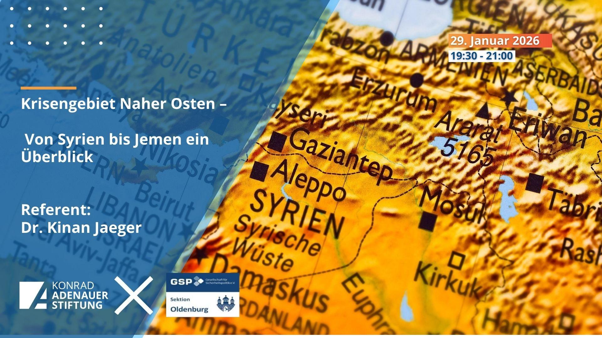 Ziel der Veranstaltung ist es, Hintergründe verständlich zu erläutern, Zusammenhänge aufzuzeigen und Raum für eine differenzierte Auseinandersetzung mit der Lage im Nahen Osten zu schaffen. Die Konrad-Adenauer-Stiftung lädt in Kooperation mit der Gesellschaft für Sicherheitspolitik Sektion Oldenburg Interessierte dazu ein, sich über die Entwicklungen von Syrien bis Jemen zu informieren und gemeinsam über Perspektiven für Frieden, Stabilität und politische Ordnung in der Region zu diskutieren.