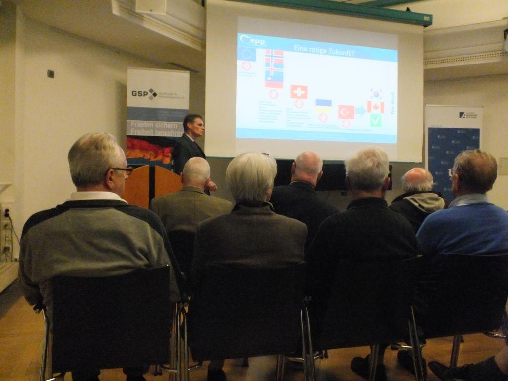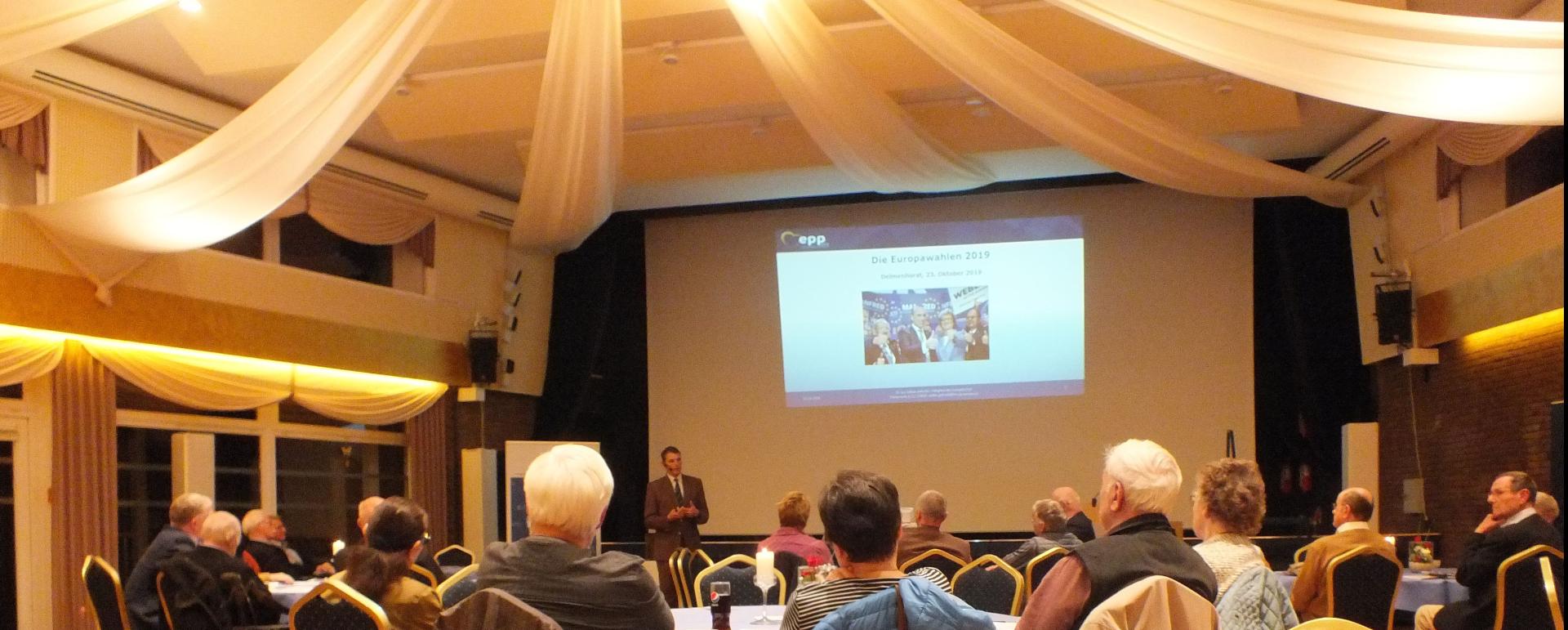 Zu Beginn des Vortrags wurden die Wahlkämpfe 2014 und 2019 zur Europwahl mit starkem Fokus einzelner Parteien auf die nationalen Gesetzgebungskompetenzen im Verhältnis zu den europäischen dargestellt. Darüber hinaus wurden die Mehrheitsverhältnisse in Rat und Parlament nach den Europawahlen 2019 dargelegt. Die Entwicklung führt in der Tendenz zu einem höheren Grad an Politikverdrossenheit , da Mehrheiten in der Gesetzgebung schwieriger herbeizuführen sind, so dass Gesetzgebung in der Tendenz komplexer wird und greifbare Ergebnisse seltener am Ende des Prozesses stehen.