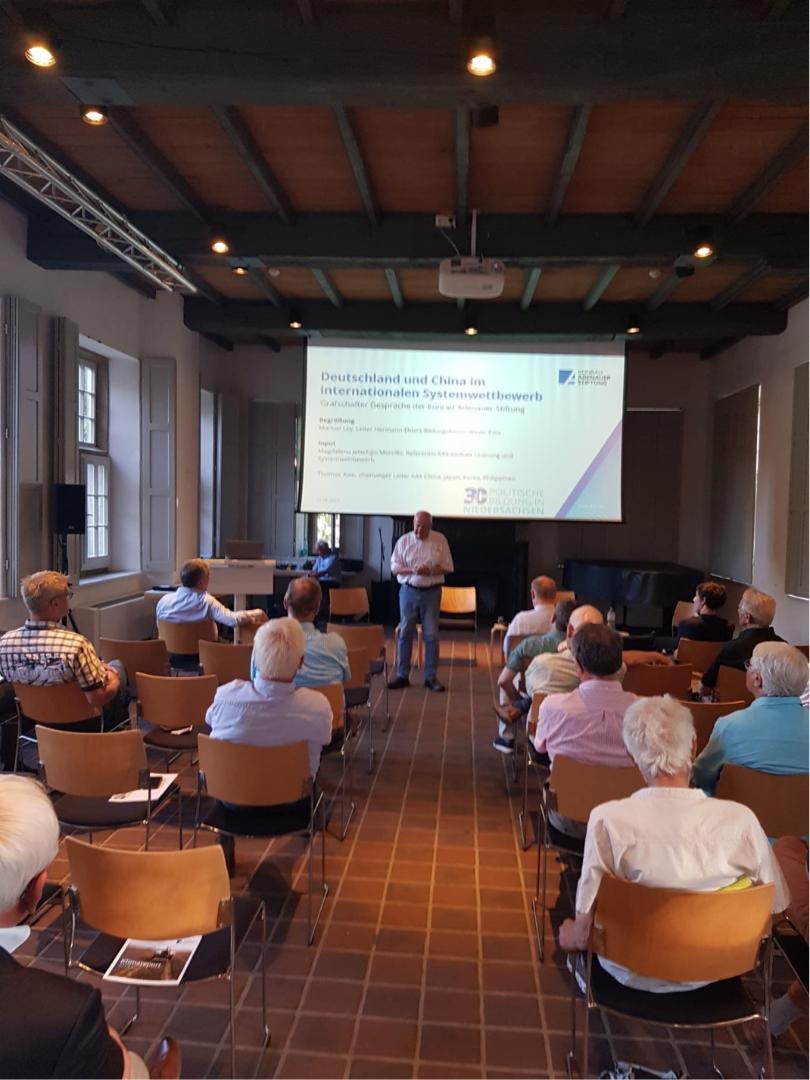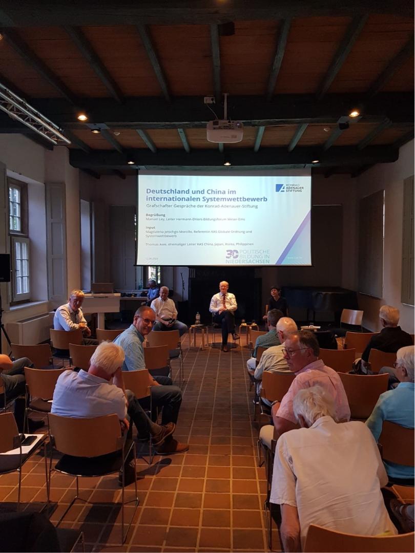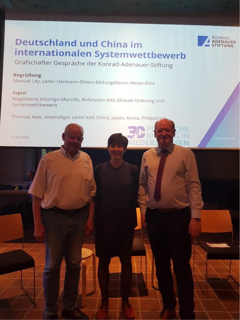 Im Rahmen einer Abendveranstaltung am 12.06 im Kolster Frenswegen diskutierten Magdalena Jetschgo-Morcillo, Referentin der Konrad-Adenauer-Stiftung (KAS) für Globale Ordnung und internationalen Systemwettbewerb, Thomas Awe, ehemaliger Leiter der KAS in China und der ehemalige niedersächsische Finanzminister Reinhold Hilbers MdL über Deutschland und China im internationalen Systemwettbewerb.
