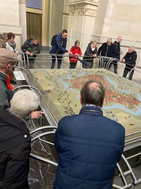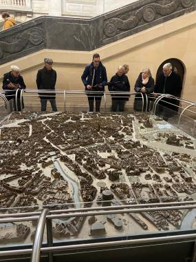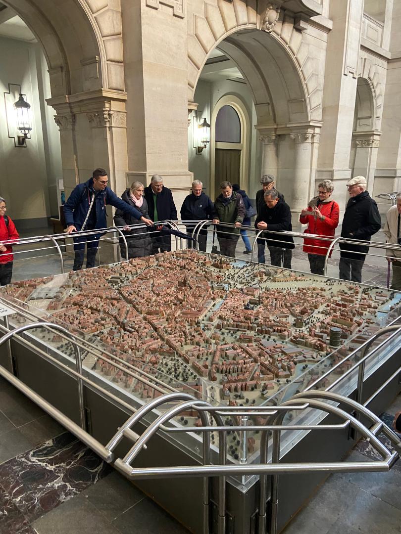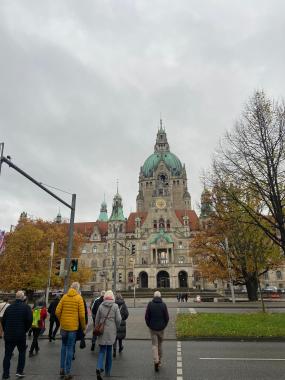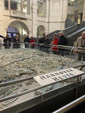 In Hannover angekommen gab es eine politisch-historische Stadtführung. Nach einer Besichtigung des Denkmals der Göttinger Sieben und des Trammplatzes ging es ins Neue Rathaus. Hier schauten wir uns die Überblicke und Veränderungen der Stadt über die Jahre 1689, 1939, 1945 und heute an. Dann am Leineufer vorbei ging es danach zur Marktkirche und dem Alten Rathaus.