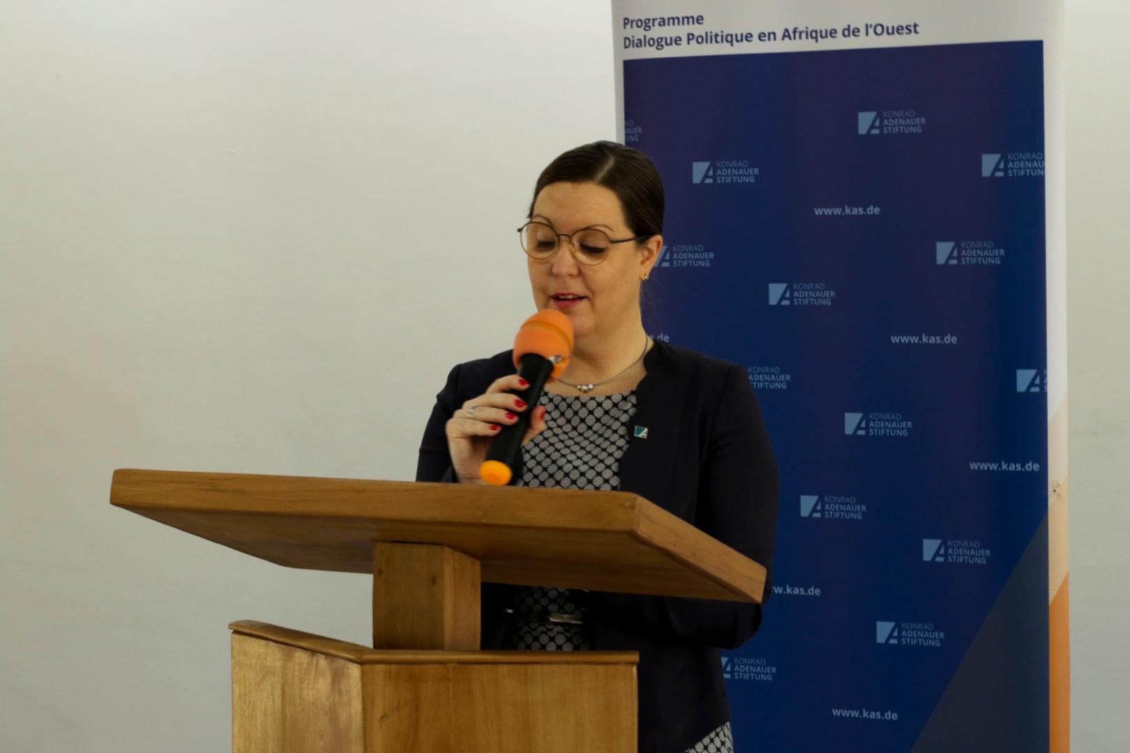 Le mardi 28 février, après le mot de bienvenue de M. Ekwa-Bebe III, la représentante résidente de la Konrad-Adenauer-Stiftung (KAS) et directrice du Programme régional pour le Dialogue Politique en Afrique de l'Ouest, Dr. Stefanie Brinkel, a exhorté les participants à plus de qualité dans leur travail, espérant qu'un jour il y ait parmi eux des "Ebony", le prix ivoirien des médias, dont la cérémonie avait eu lieu le week-end avant l'Atelier Médias.