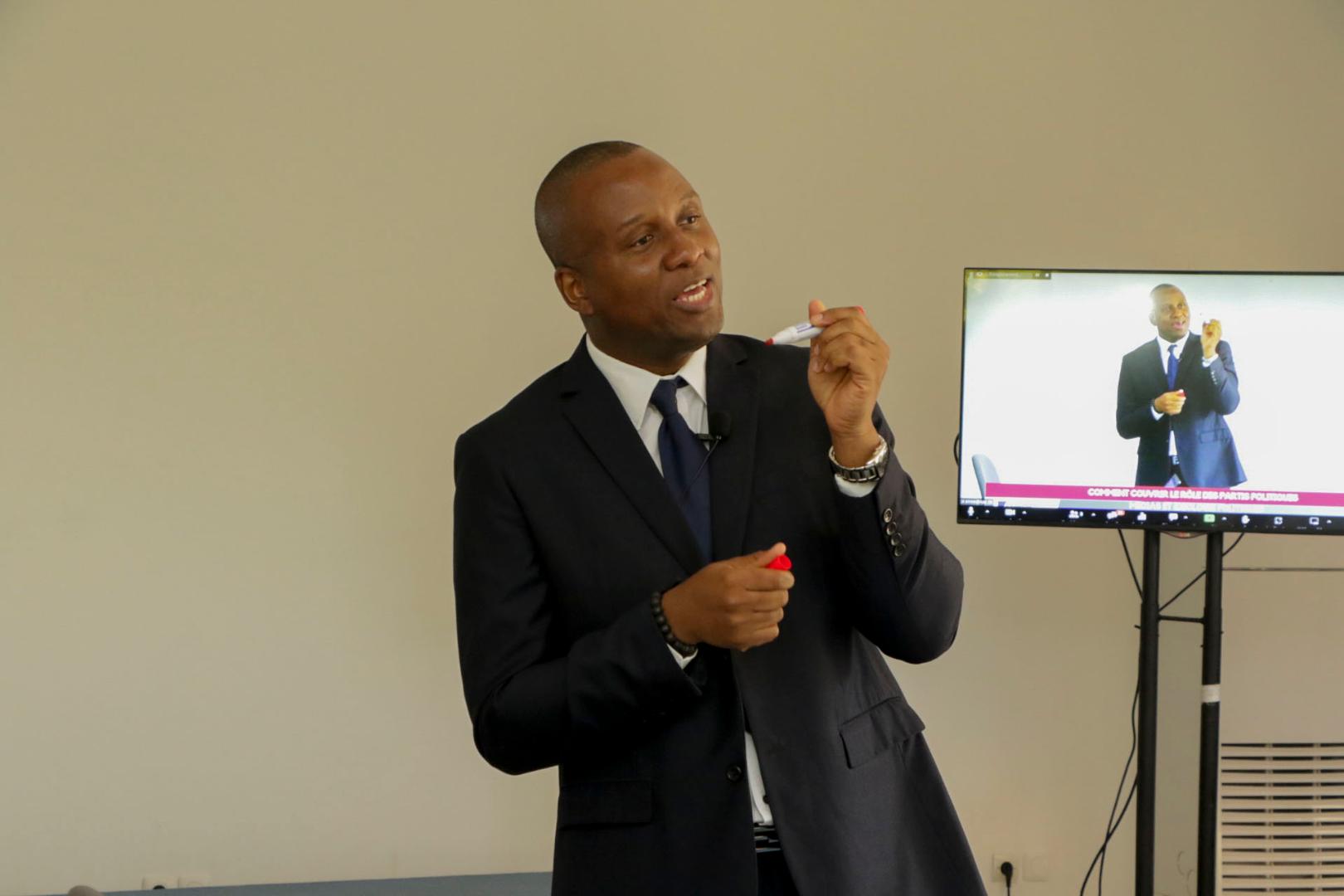 Après la photo de groupe, le politologue et directeur du Centre de recherche politique d'Abidjan (CRPA) Dr. César Moquet Flan a entretenu les participations en salle et en ligne sur "Idéologies politiques, histoire, implications et exemples". Par la suite, l'expert médias et marketing politique et CEO de Siyabonga Gold Group, Gérard Guèdègbé, a pris le relais avec des sessions sur "Comment couvrir le rôle des partis politiques", "Collecte d'informations politiques et rédaction d’articles", "Activités des partis politiques et reportages politiques".