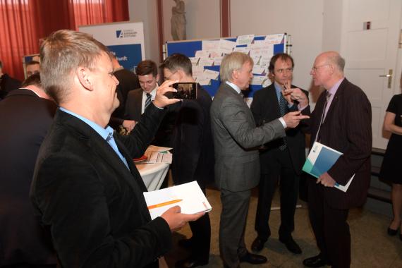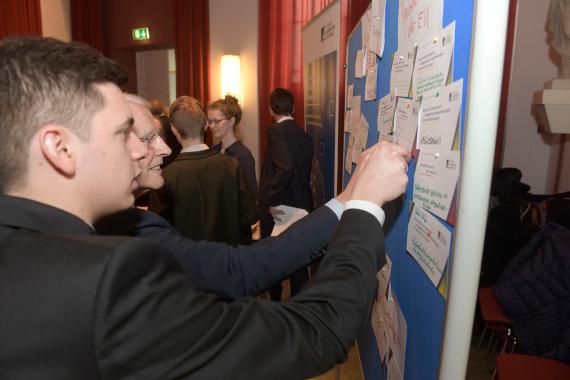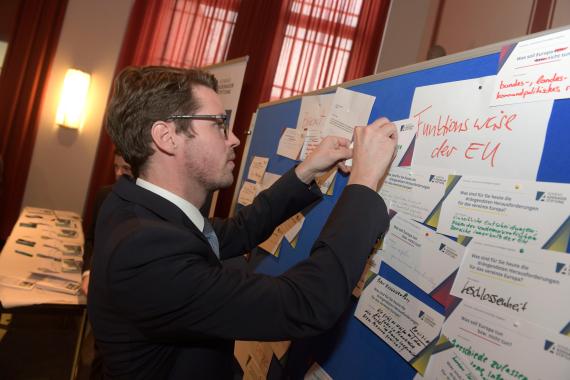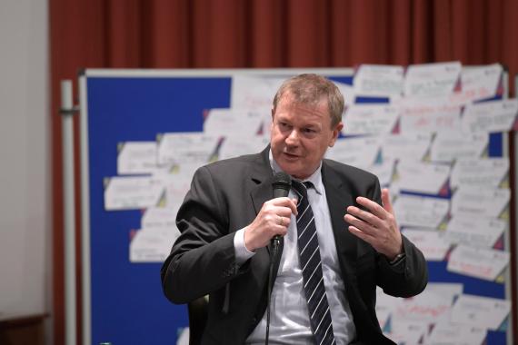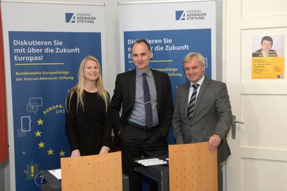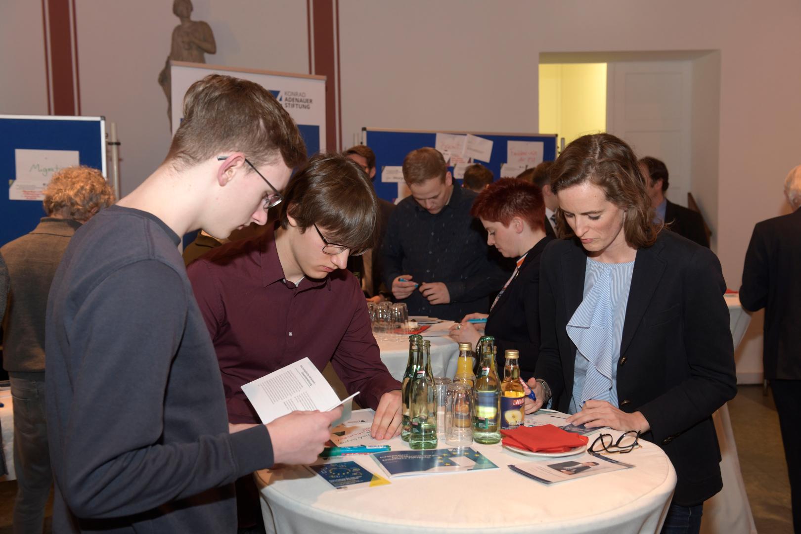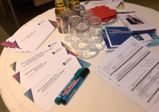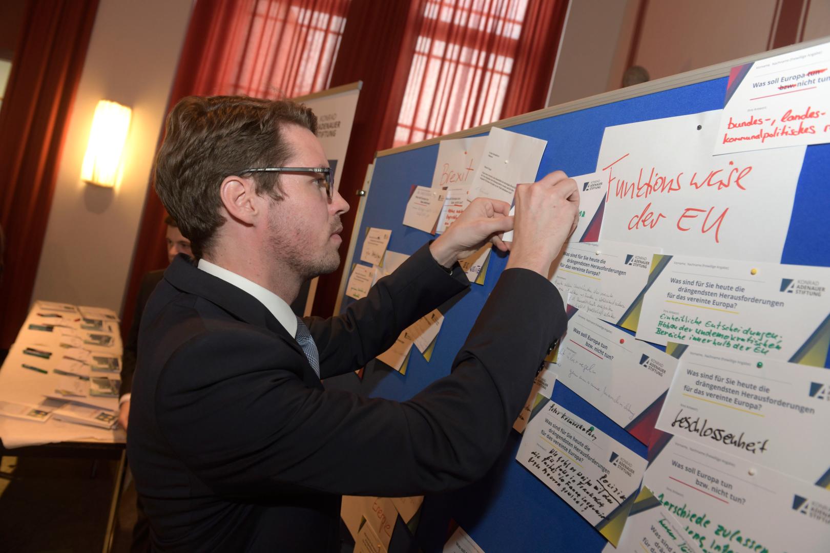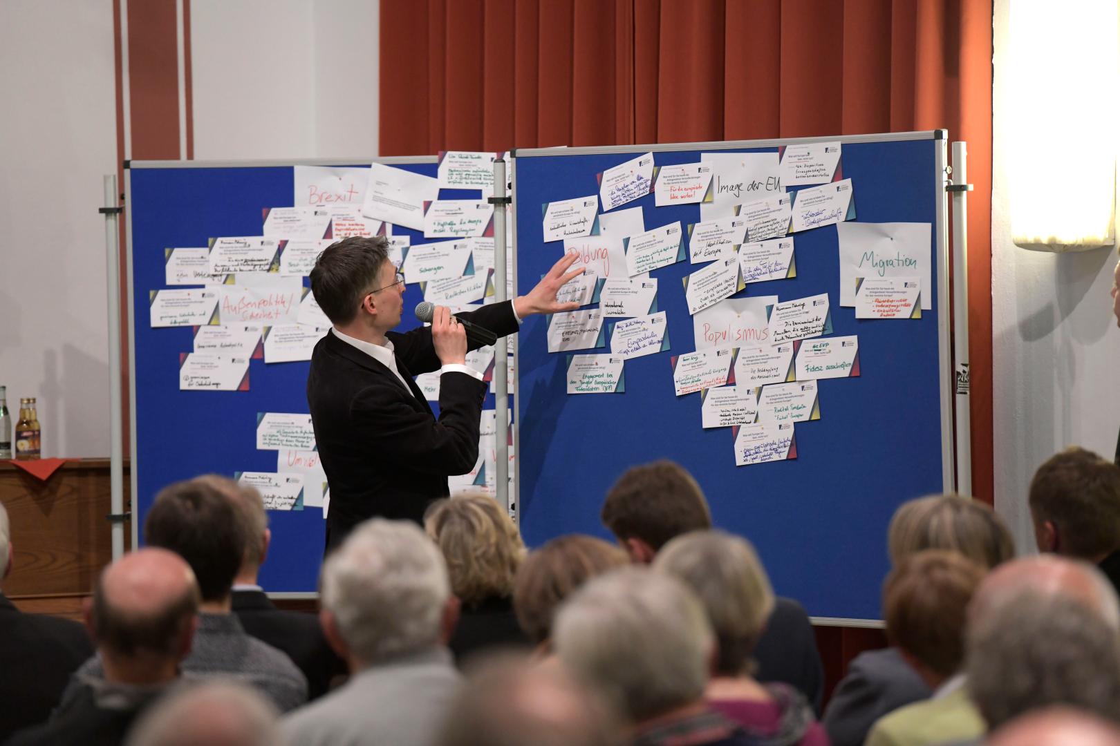 Bevor die Diskussion losgeht, schreiben die Gäste ihre Antworten auf kleine Karten und bestimmen so, worüber gesprochen wird. In seiner Begrüßung freut sich der Landesbeauftragte der Konrad-Adenauer-Stiftung für NRW, Dr. Ludger Gruber, über das große Interesse: „Wir merken, Sie wollen über Europa reden.“ Ein erster Impuls kommt aus dem Zentrum der europäischen Politik: Dr. Markus Pieper MdEP spricht über Themen, bei denen die EU zusammenarbeiten muss – von der Finanz- bis zur Umweltpolitik. Es sei natürlich nicht immer alles richtig gemacht worden, aber „es ist besser, Europa zu verbessern, als es zu zerstören“.