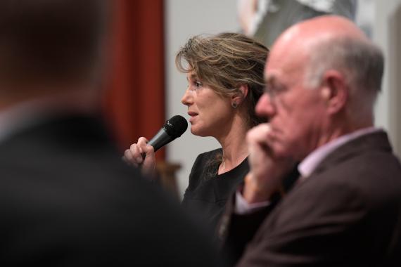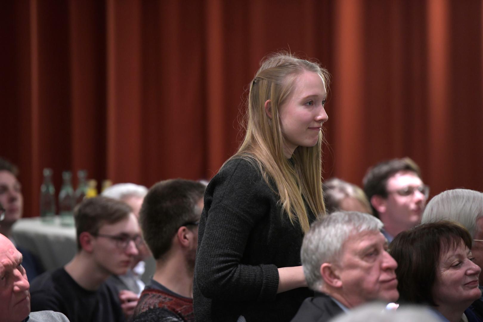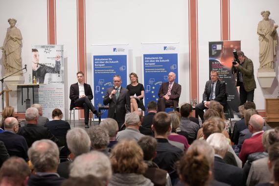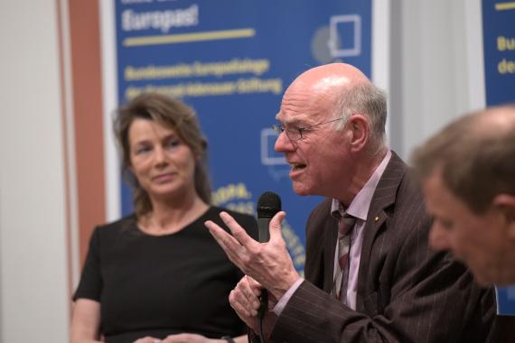 Im Vorfeld der Diskussion hat sich durch die beschrifteten Karten des Publikums das Thema der Funktionsweise der EU herauskristallisiert. Bei der Frage nach den Vereinigten Staaten von Europa, die laut einer jungen Frau im Publikum „eine Vision von jedem überzeugten Europäer sein sollten“, plädiert Pieper dafür, erstmal für den zentralen Bestand der EU zu kämpfen und dann weiterzusehen. Lammert ergänzt: Eine Zielvorstellung müsse jede Generation aufrechterhalten, denn „ohne die Träumer hätten die Realisten in der EU nicht angefangen und ohne die Realisten wäre nichts entstanden“. Ebbesmeier erklärt, es sei auch Aufgabe der Schulen, die europäischen Themen zu finden, die Jugendliche berühren – sei es der Uploadfilter oder der Umweltschutz.
