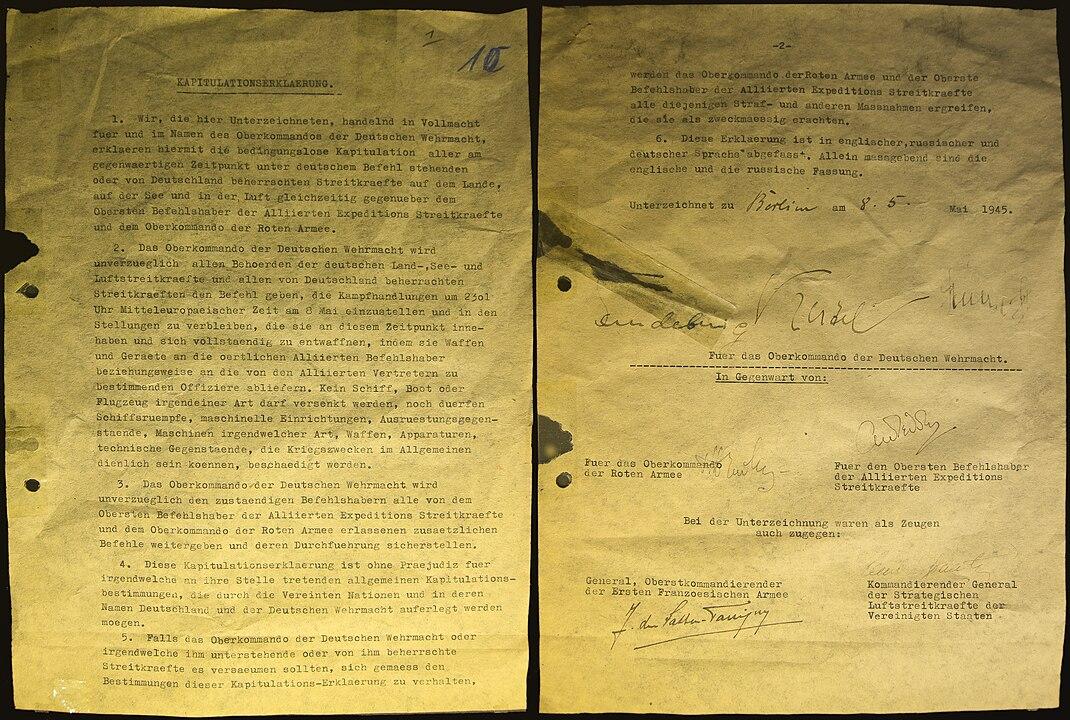 Kapitulationserklärung der Deutschen Wehrmacht vom 8. Mai 1945 (Deutsch-Russisches Museum Berlin-Karlshorst). Neptuul - Eigenes Werk CC BY-SA 4.0