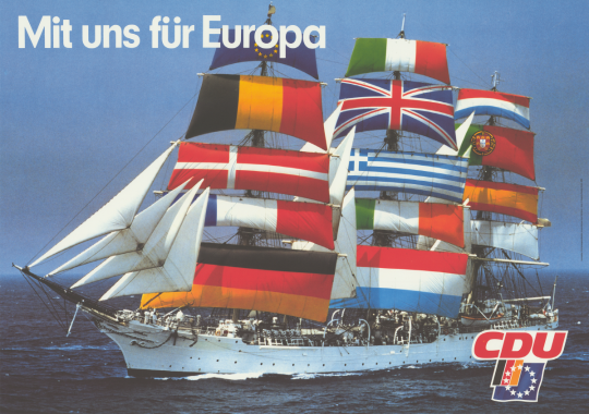 Links: Europawahlplakat von 1979; Mitte: Deckblatt des gemeinsamen Europawahlprogramms der CDU und CSU von 2019; Rechts: Europawahlplakat von 1994 KAS/ACDP