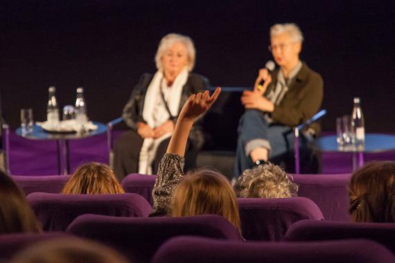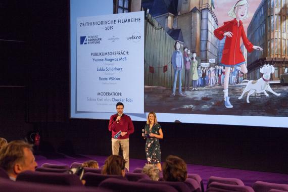 Zum anschließenden Filmgespräch begrüßten Jan Philipp Wölbern und Kathrin Zehender die Zeitzeugin Edda Schönherz, Yvonne Magwas MdB und die Drehbuchautorin Beate Völcker. Für Magwas, die zum Zeitpunkt der Wende zehn Jahre alt war, weckte der Film viele emotionale Erinnerungen an die eigene Kindheit in der DDR. Eindrücklich schilderte Schönherz, die in Folge eines geplanten Ausreiseversuchs von ihren Kindern getrennt und mehrere Jahre im Stasi-Gefängnis in Hohenschönhausen inhaftiert wurde, von ihren persönlichen Erlebnissen. Dass wir die Geschichte immer wieder neu auch Kindern erzählen müssten, betonte Völcker, die bereits vor rund zehn Jahren auf die Buchvorlage zum Film aufmerksam gemacht wurde. Beim Verfassen des Drehbuches sei es ihr aber wichtig gewesen, das Thema nicht nur ernsthaft anzugehen und das Leben in einer Diktatur zu zeigen, sondern auch, dass viele Menschen „ein normales Leben in der DDR geführt“ haben.