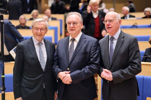 Reiner Haseloff, Ministerpräsident von Sachsen-Anhalt und derzeit dienstältester deutscher „Landesvater“, hob in seinem Vortrag hervor, dass Vogel niemals „nur“ Politiker, sondern stets auch öffentlicher Intellektueller gewesen sei, verpflichtet dem Leibnizschen Prinzip „Theoria cum Praxi“. Dabei habe ihn stets das Bewusstsein geleitet, dass Politik allenfalls für die „vorletzten Dinge“ zuständig sei, und zwar von einem klaren Wertegerüst aus betrieben werde – für Vogel der christliche Glaube –, zugleich aber von Toleranz, Pragmatismus und dem Gespür für das Machbare geleitet sein müsse. Hier sei der Einfluss von Vogels akademischem Lehrer und Doktorvater Dolf Sternberger spürbar, für den der Friede „Grund und Merkmal und die Norm des Politischen“ gewesen sei. Vogels deutschlandpolitische Grundsätze, wonach am Wiedervereinigungsgebot des Grundgesetzes festzuhalten sei, aber das Prinzip „Freiheit vor Einheit“ bzw. „Einheit nur in Freiheit“ gelte und Wiedervereinigung und europäische Integration zwei Seiten derselben Medaille seien, hätten sich letztlich eindrucksvoll bestätigt.