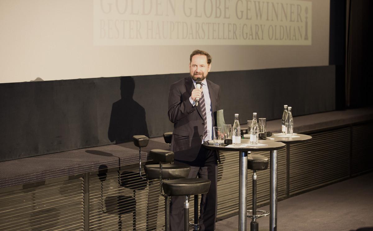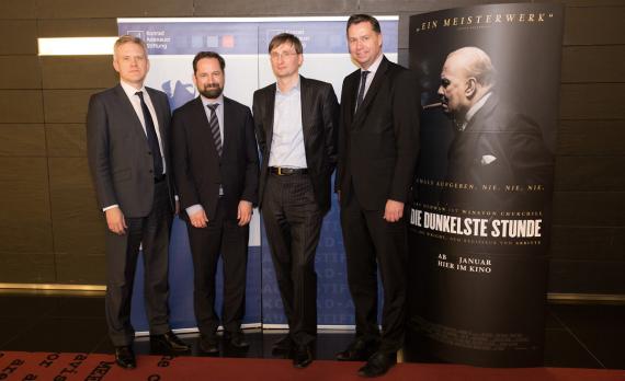 Das historische Filmdrama „Die dunkelste Stunde“ wurde noch vor dem Kinostart im Rahmen der Zeithistorischen Filmreihe der Abteilung Zeitgeschichte in Kooperation mit Universal Pictures im Kino Cinestar am Potsdamer Platz in Berlin aufgeführt. Rund 350 Gäste waren der Einladung der Konrad-Adenauer-Stiftung gefolgt. Zum anschließenden Nachgespräch begrüßte Dr. Michael Borchard, stellvertretender Leiter der Hauptabteilung Wissenschaftliche Dienste/ Archiv für Christlich-Demokratische Politik, den Gesandten der britischen Botschaft Robbie Bulloch, den Vorsitzenden der deutsch-britischen Parlamentariergruppe im Deutschen Bundestag Stephan Mayer MdB und den Potsdamer Militärhistoriker Professor Sönke Neitzel.
