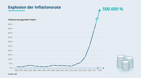 Besonders hart trifft die Menschen in Venezuela vor allem die extreme Inflation. Der Internationale Währungsfonds geht davon aus, dass die Hyperinflation in diesem Jahr kaum mehr messbare 200.000 Prozent erreichen wird. Auch verglichen mit Bürgerkriegsländern wie etwa Libyen oder Südsudan, die Inflationsraten von 30 bis 90 Prozent verzeichnen, ist dieser Wert unbeschreibbar hoch. Für die Venezolaner bedeutet dies ein Leben in extremen Mangel: Der in der Landeswährung ausgezahlte Lohn hat praktisch keinerlei Wert und reicht nicht einmal für Grundnahrungsmittel.