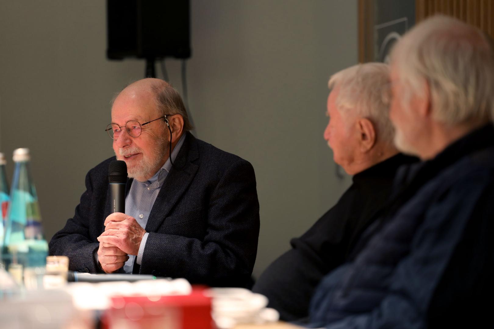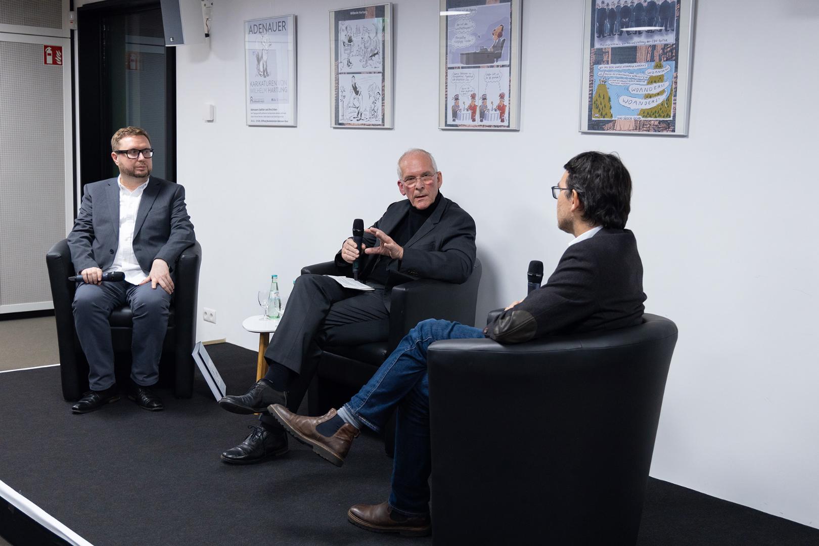 Im Publikum kam später die Frage auf, ob ein Karikaturist aktuell nicht von ganz anderer Seite bedroht werde, nämlich durch die Nutzung von KI. Das konnte Heiko Sakurai nicht verneinen. Freilich hoffe er als 52-Jähriger, dass dieser Kelch an ihm vorübergehe, denn die menschliche Kreativität könne die Technik bislang noch nicht ersetzen oder simulieren.Das dritte und letzte Expertengespräch fand am 30. November 2023 in Berlin statt, und zwar im Alten Postamt von Friedenau (heute: PSD Bank Berlin-Brandenburg), das sich in den letzten Jahren als Kultur- und Veranstaltungsort im Südwesten der Hauptstadt etablieren konnte. Auf dem Podium nahmen dort Platz: der Moderator Walther Fekl, Karikaturenexperte mit deutsch-französischem Schwerpunkt und Mitautor des Hartung-Bandes, sowie die beiden Karikaturisten Klaus Stuttmann aus Berlin, nach Frankfurt nun schon zum zweiten Mal dabei, und Karl-Heinz Schoenfeld aus Potsdam, jahrzehntelang als Stammzeichner bei der „Bild“-Zeitung und anderen Springer-Blättern beschäftigt und auch heute noch gelegentlich für verschiedene Regional- und Lokalzeitungen tätig. Der 95-jährige Schoenfeld hatte Adenauer Mitte der 1960er Jahre sogar noch persönlich in Rhöndorf getroffen, nachdem dieser durch eine besonders gelungene Zeichnung in der „Bild“ auf ihn aufmerksam geworden war und deshalb zu sich nach Hause eingeladen hatte.