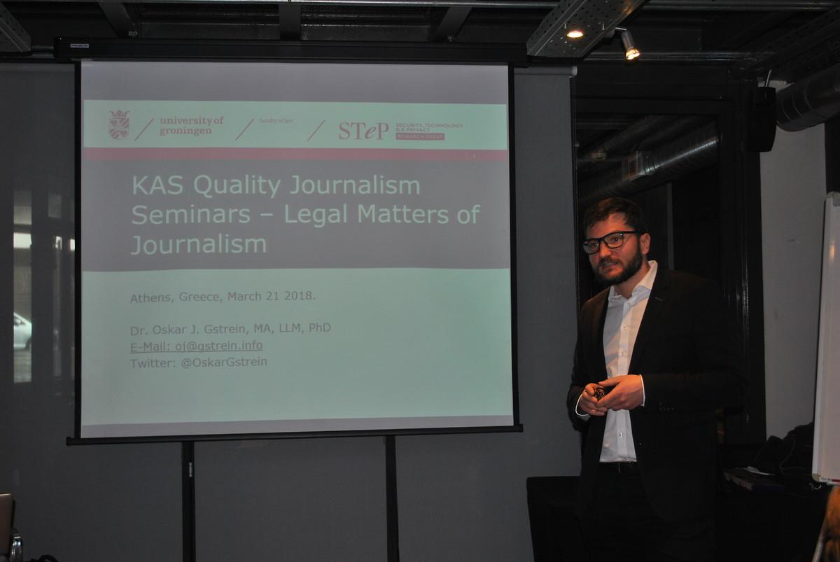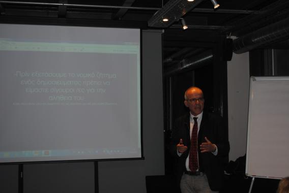 Το ελληνικό νομικό πλαίσιο απετέλεσε το αντικείμενο της παρουσίασης του Δημήτριου Αναστασόπουλου, μέλους του ΔΣ του Δικηγορικού Συλλόγου Αθηνών, αλλά και συνιδρυτή και προέδρου της Ένωσης Ελλήνων Νομικών "eΘέμις". ο κος Αναστασόπουλος παρουσίασε τις σχετικές διατάξεις του Συντάγματος, των σχετικών νόμων και του Κώδικα Δεοντολογίας των Δημοσιογράφων, ενώ ανέλυσε σειρά αποφάσεων των ανωτάτων και κατώτερων δικαστηρίων της χώρας μας. Θέματα όπως η δυσφήμιση, η ευθύνη του εκδότη, το copyright βρέθηκαν στο επίκεντρο της εισήγησής του.