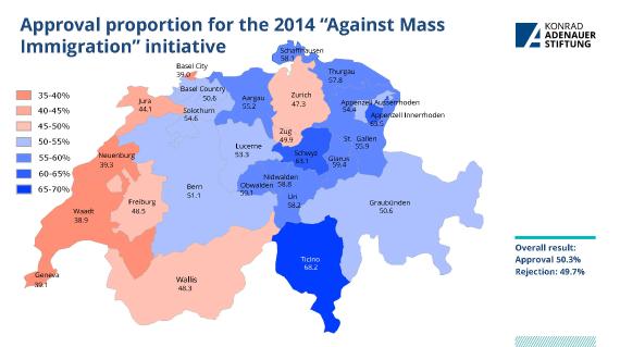 By clearly rejecting the initiative with a total of 61.7%, the Swiss have sent a clear signal of continuity in EU-Swiss relations. The proposal also received a clear rejection from the cantons, with only four of the 26 cantons receiving a (very narrow) majority (Ticino, Schwyz, Glarus, Appenzell-Innerrhoden)[2]. The rejection was particularly clear-cut in the cantons of western Switzerland: in Geneva, Jura, Vaud and Neuchâtel, the SVP initiative received less than a third of the votes, and in Basel-Stadt only around 25.4%. In some cantons of northern and eastern Switzerland (Schaffhausen, Thurgau), which are considered SVP strongholds in parliamentary elections, the initiative clearly failed as well. As expected, there are distinct differences between parts of the country: only in the Italian-speaking Ticino did the proposal receive a narrow majority of 53.1%. In German-speaking Switzerland and especially in French-speaking Switzerland, it was clearly rejected. The rejection is particularly clear-cut in the larger cities: in Berne the initiative received only 16%, in Lausanne and Zurich only about 21%, in Basel 24.9%, in Lucerne 26.2%, in Winterthur just under 28% and in Geneva 30.3%. Voter turnout was remarkably high, at 59.5% overall.