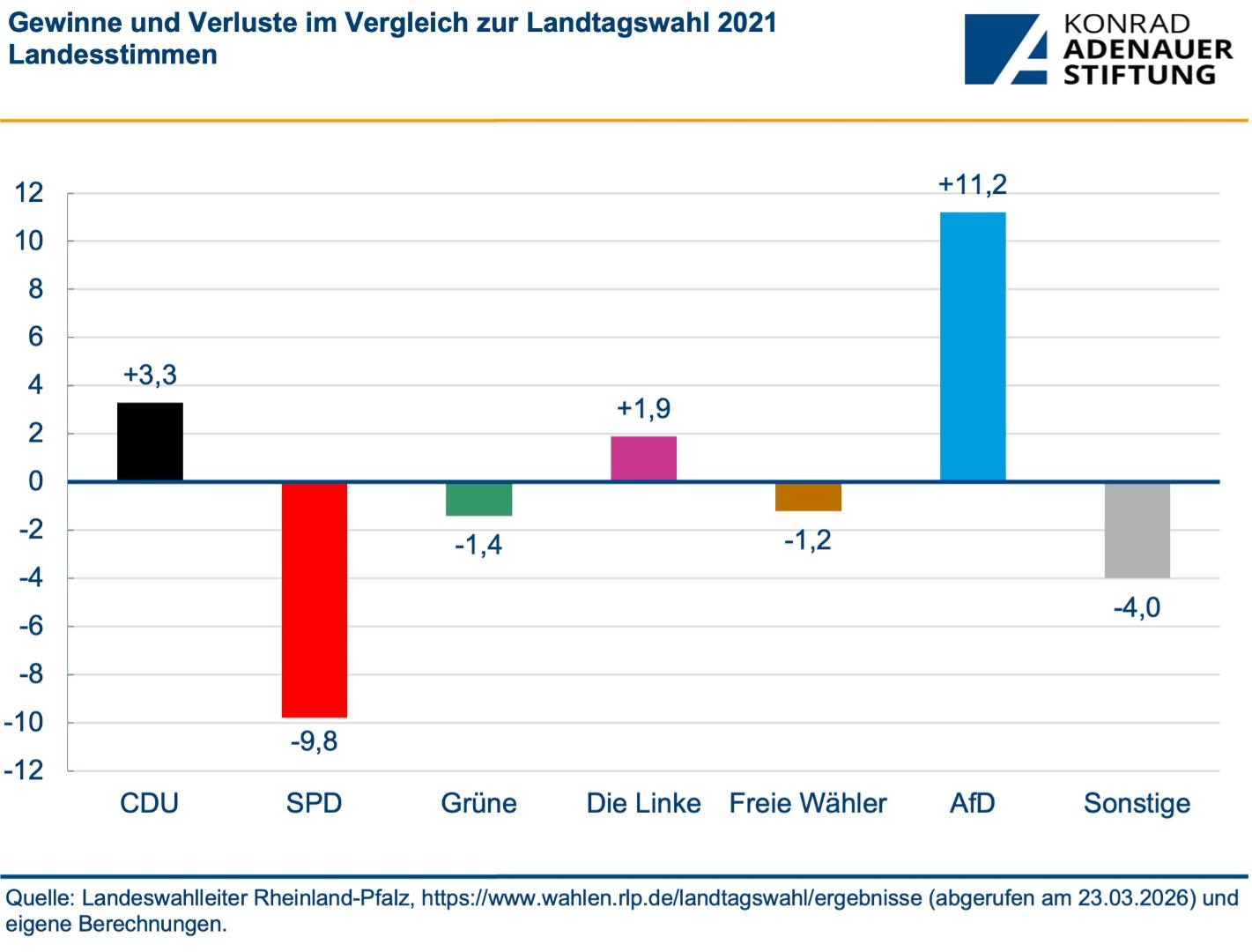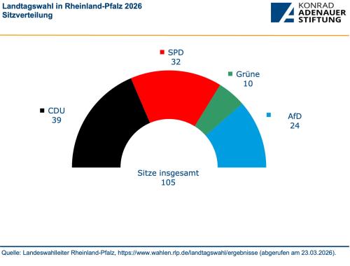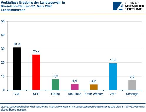 After 35 years in opposition, the CDU wins the election as strongest party in Rhineland-Palatinate with 31.0 percent and Gordon Schnieder will become Minister-President. After significant losses, the SPD achieved 25.9 percent, its worst-ever result in the state. The other parties of the previous traffic-light coalition also lost ground. While the Greens suffered only slight losses and reached 7.9 percent, the FDP, after a loss of 3.4 percentage points, fell well short of entering the state parliament with a result of 2.1 percent. The AfD more than doubled its share of the vote, achieving 19.5 percent – by far its best result in the state. Die Linke and the Freie Wähler failed to pass the five-percent threshold.