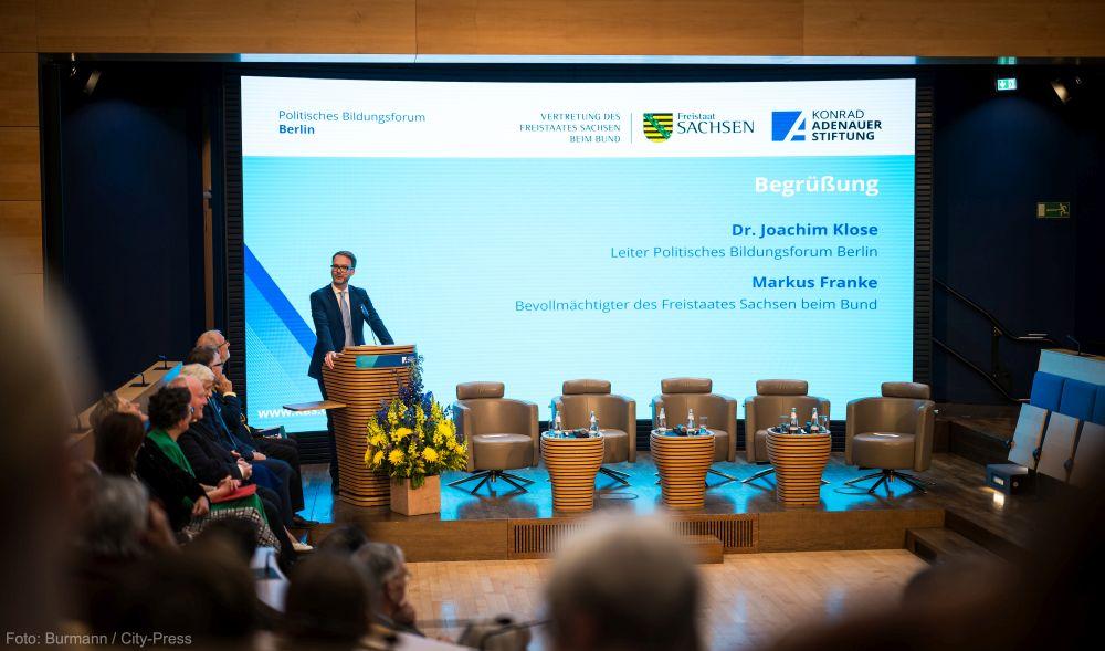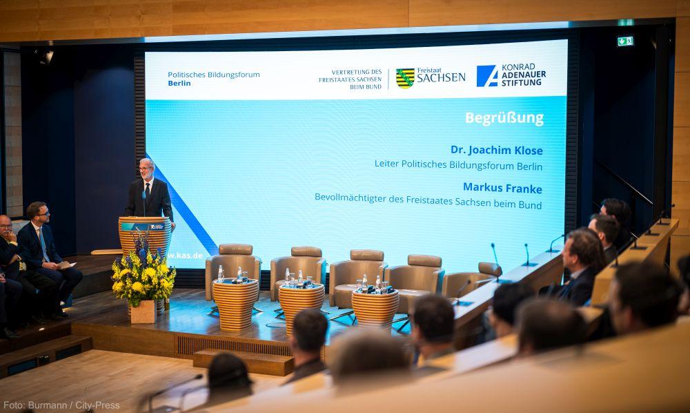 Zur Begrüßung führte Dr. Joachim Klose, Landesbeauftragter der Konrad-Adenauer-Stiftung für Berlin, in die Thematik ein. Er betonte, dass der Krieg gegen die Ukraine das Verhältnis zwischen Europa und seinen östlichen Nachbarn grundlegend verändert habe. „Die Ukraine ist näher an Europa gerückt“, so Klose, doch daraus ergäben sich auch neue Herausforderungen und Verantwortlichkeiten. Er warf die Frage auf, ob der Vorwurf der Zögerlichkeit des Westens und einer zu langen Reaktionszeit berechtigt sei.